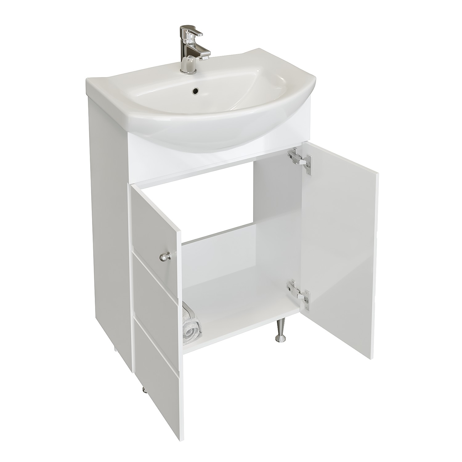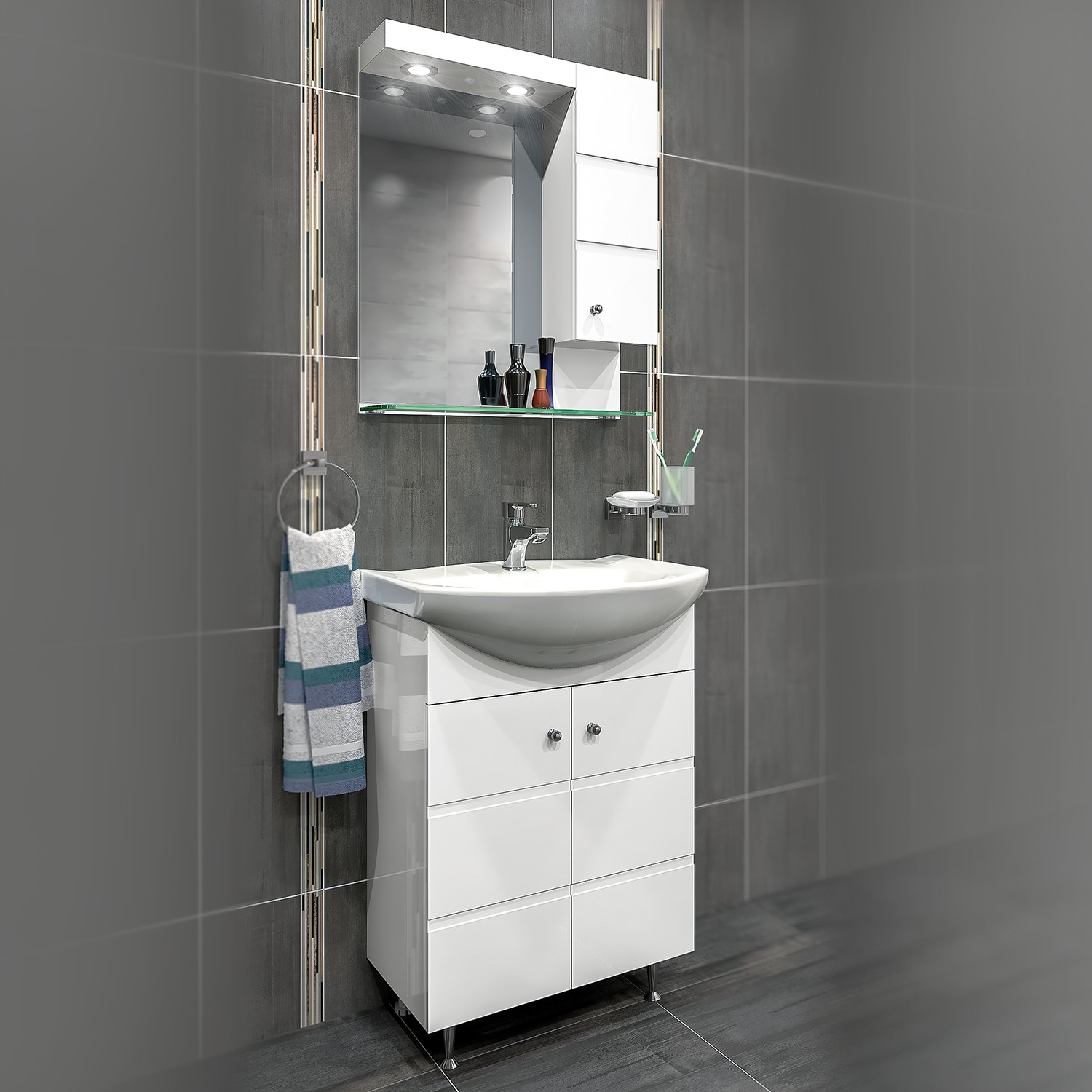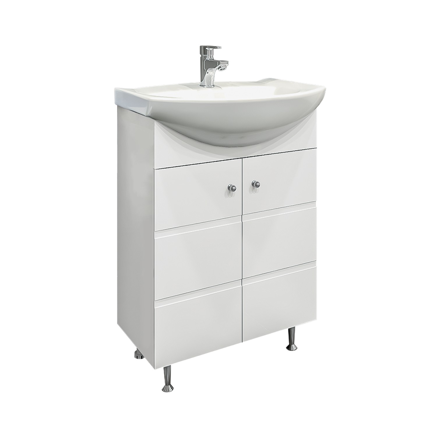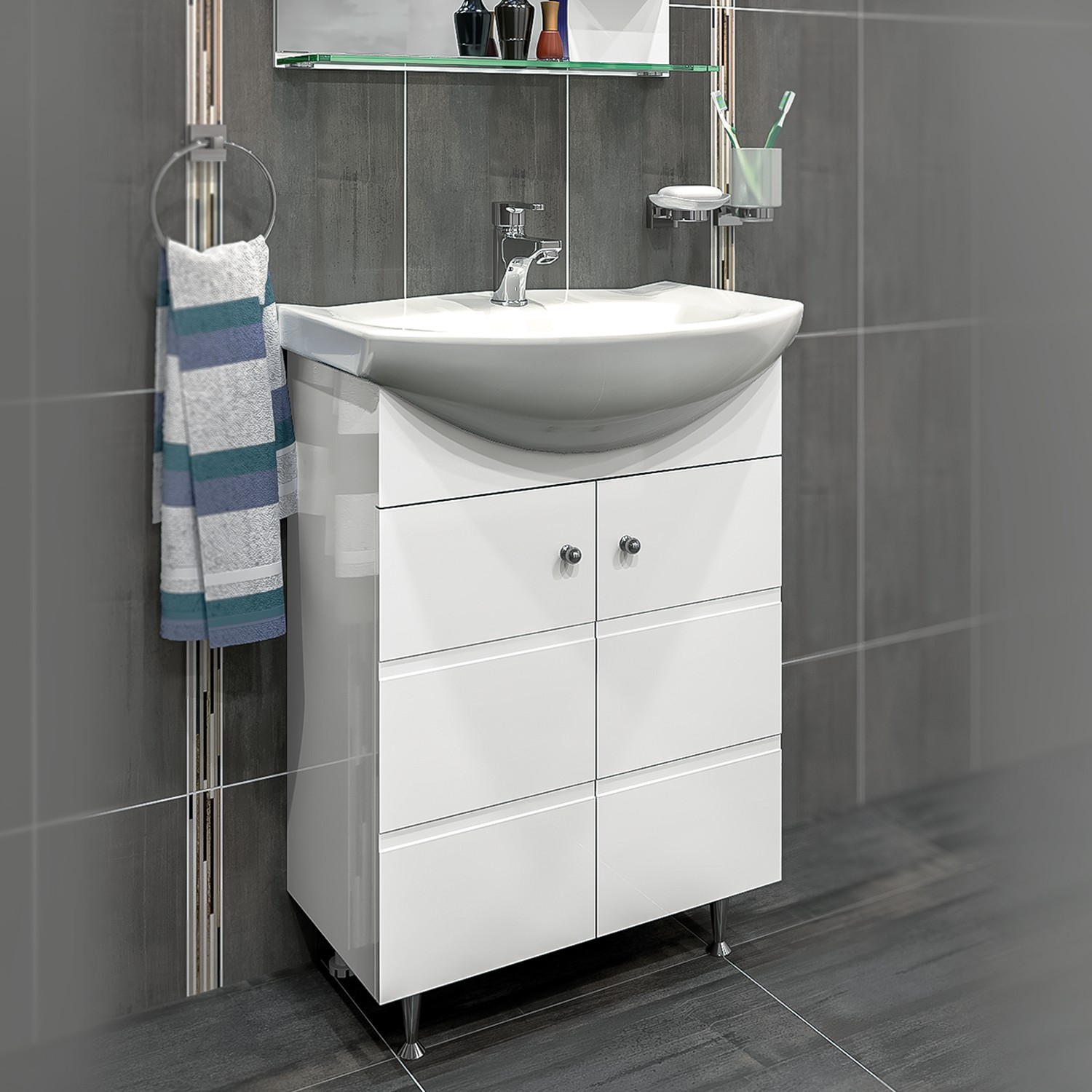 Модерен водоустойчив шкаф за баня с две врати със стилни декоративни елементи и плавно затваряне.