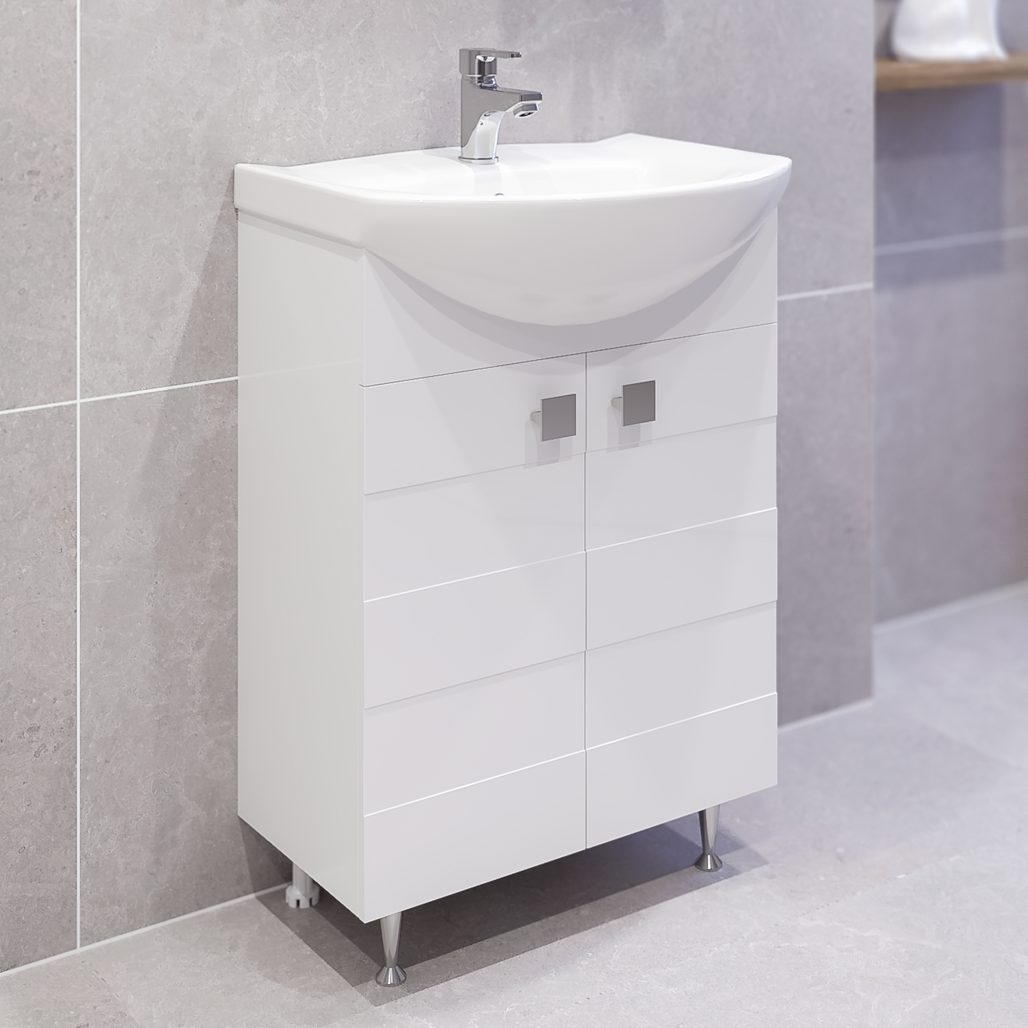Модерен водоустойчив шкаф за баня с две врати със стилни декоративни елементи и плавно затваряне.