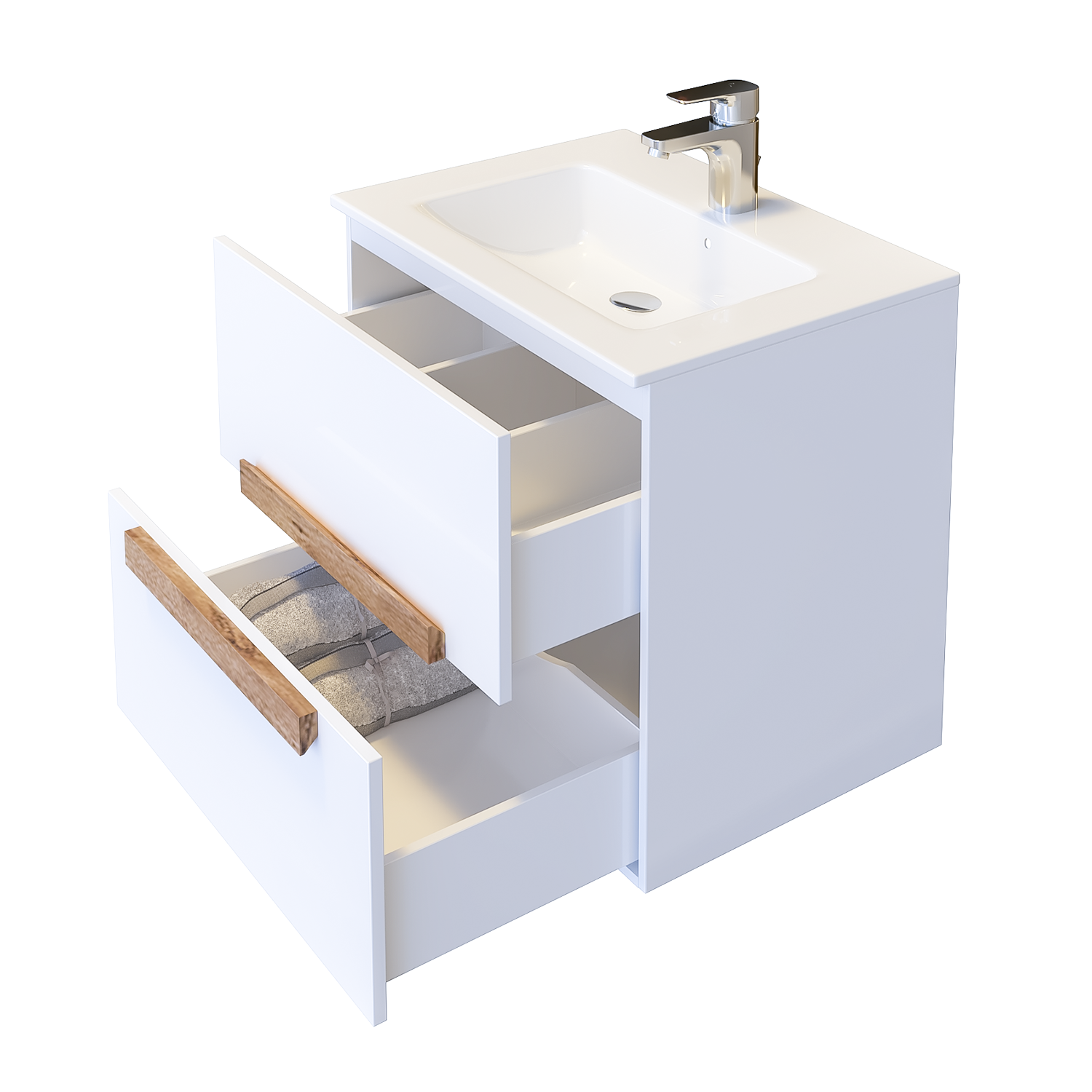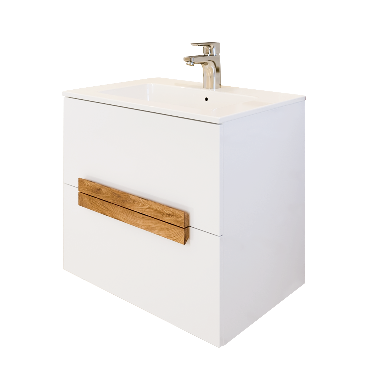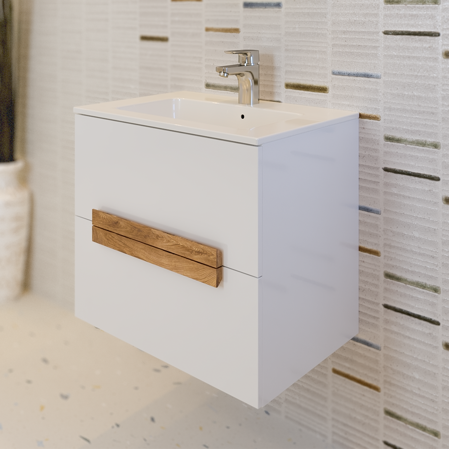 Водоустойчив шкаф в бяло с дръжки в дървесен цвят.