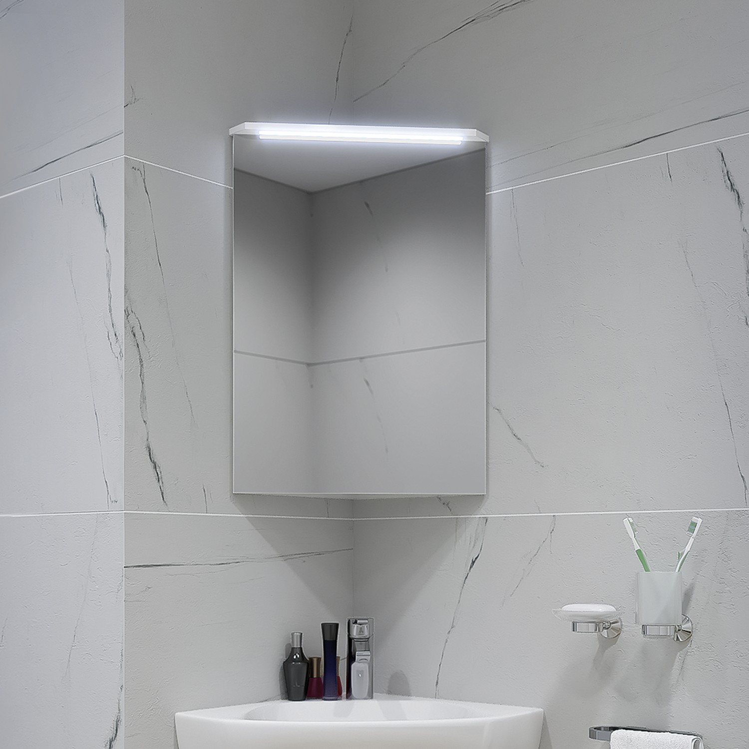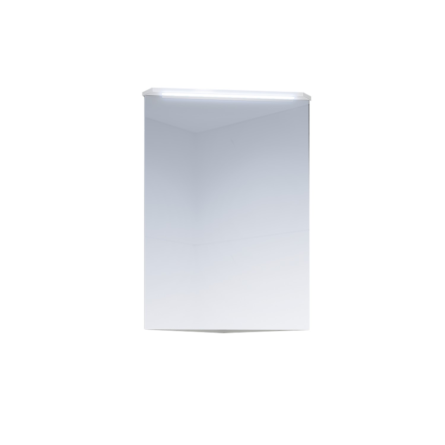 Практичен ъглов горен шкаф за баня с LED вградено осветление. Eдна вратичка с огледало и две стъклени полици, които функционално разпределят пространството за тоалетни принадлежности.