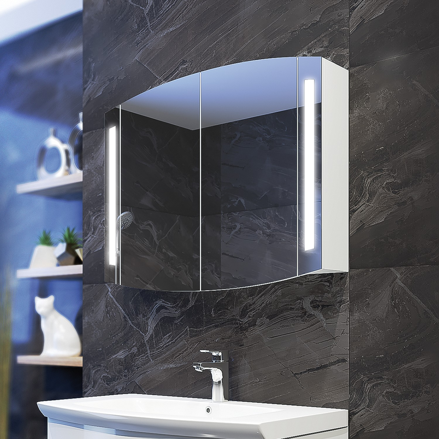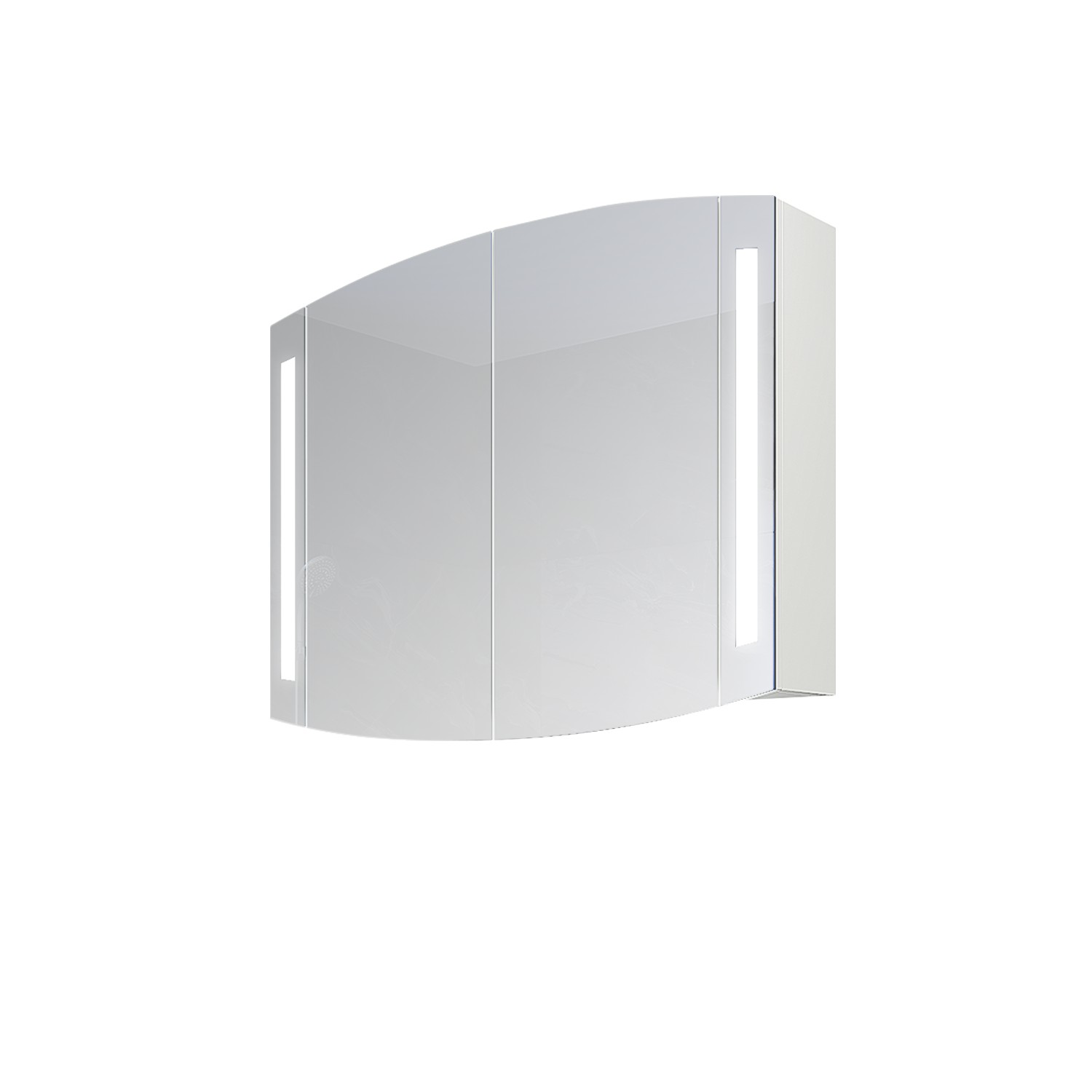 Практичен горен шкаф за баня с вградено LED осветление. Две врати с огледало и един стъклен рафт, който функционално разпределя пространството за козметика и тоалетни принадлежности.