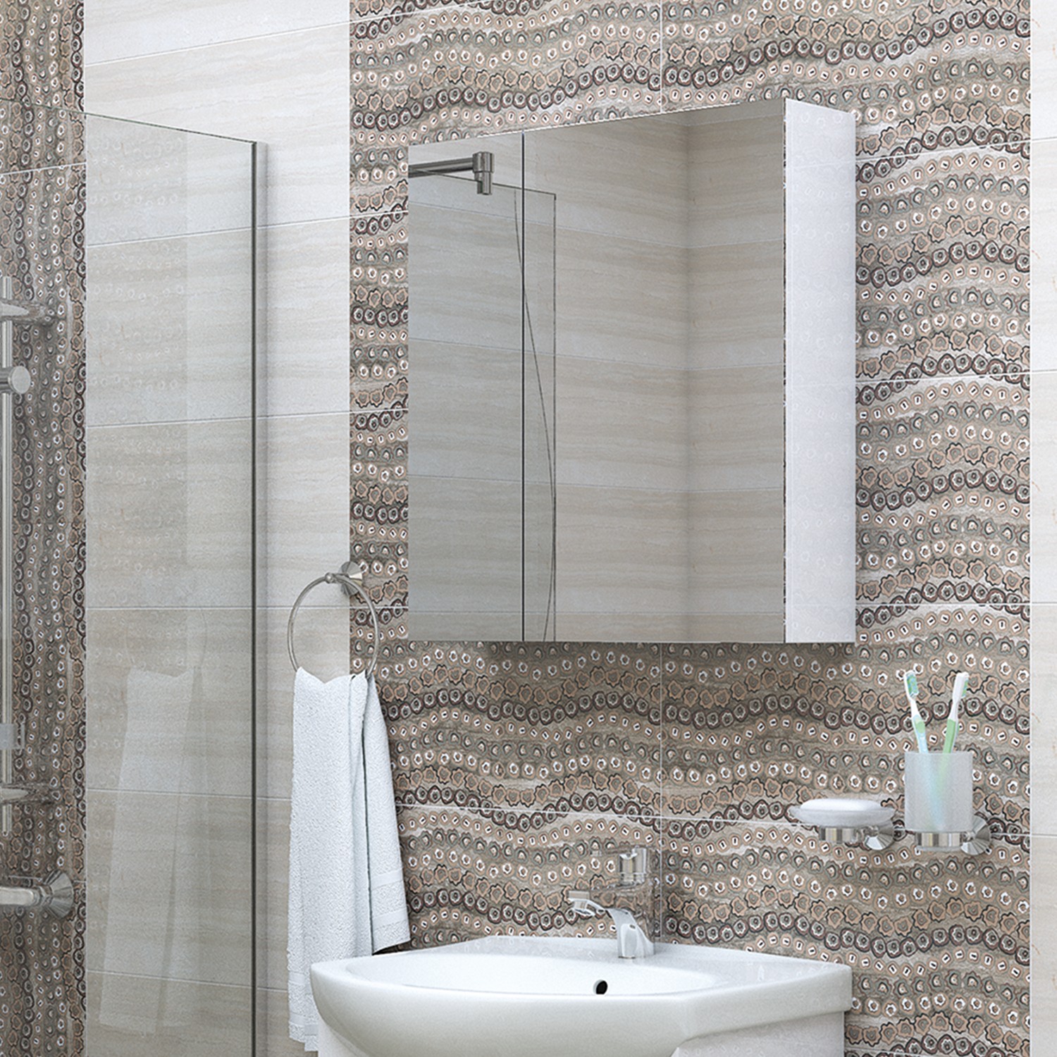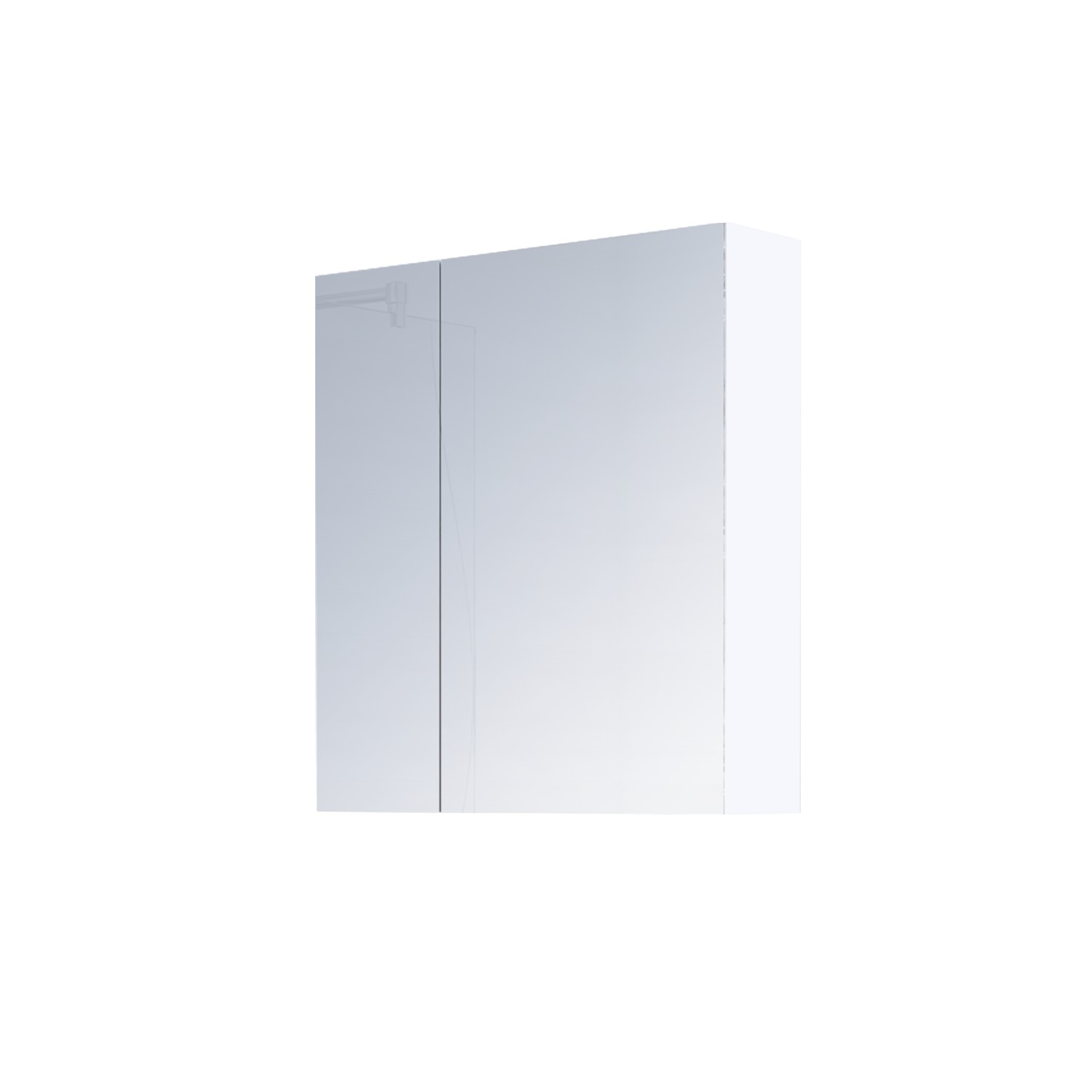 Практичен горен шкаф за баня с две врати с огледало и две стъклени полици, които функционално разпределят пространството за козметика и тоалетни принадлежности.