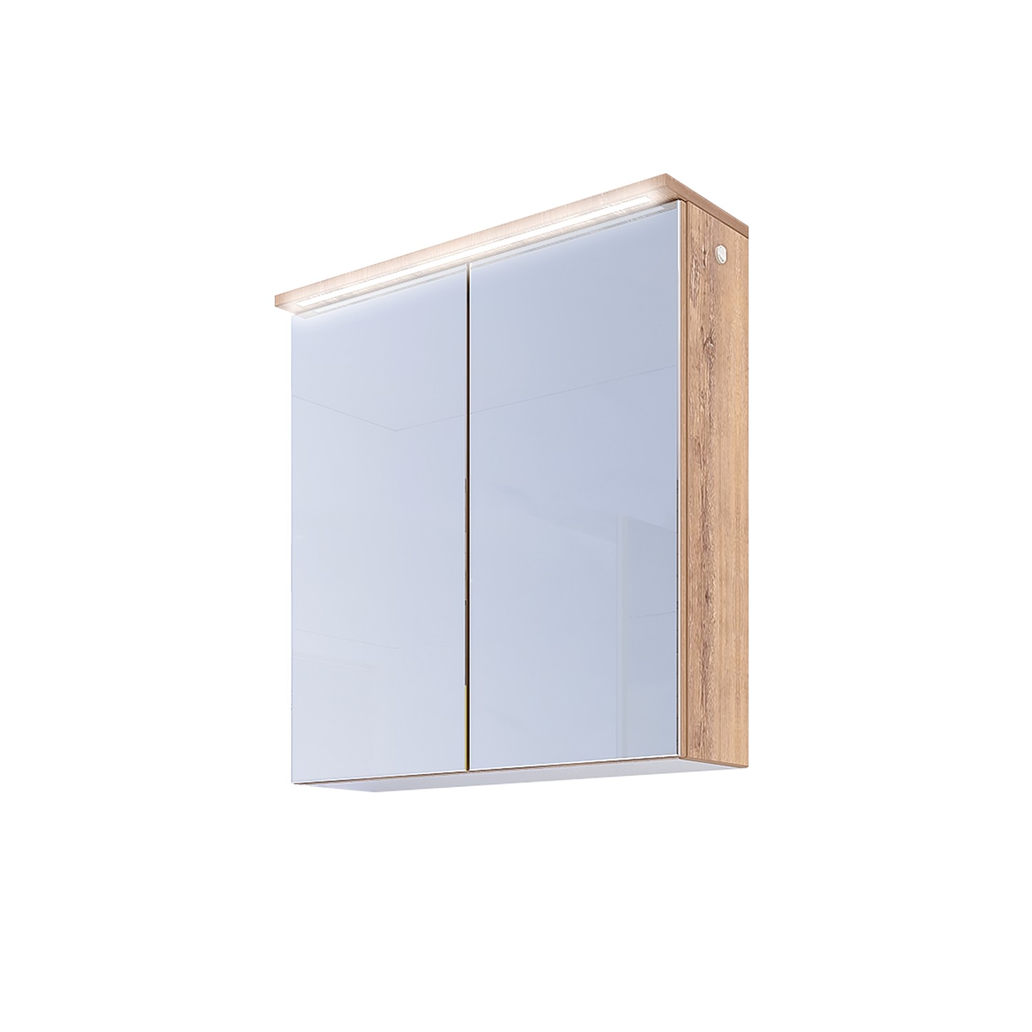Практичен горен шкаф за баня с LED осветление. Две врати с огледало и един стъклен рафт, който функционално разпределя пространството за козметика и тоалетни принадлежности.