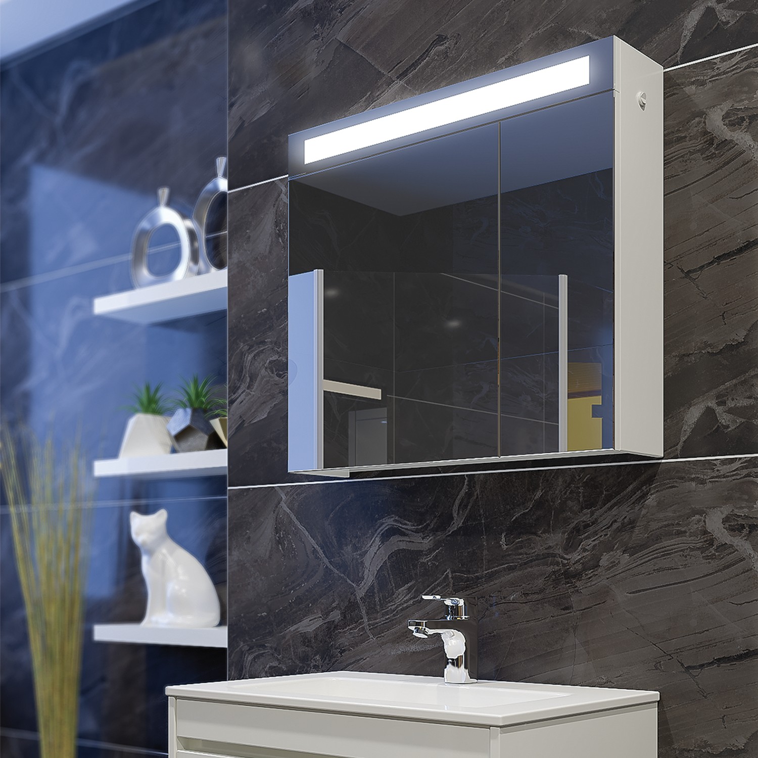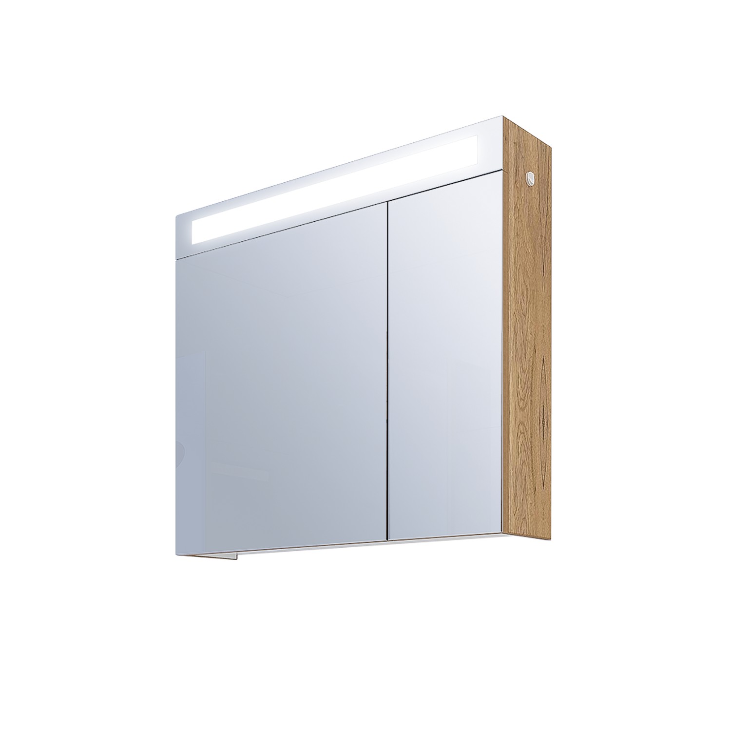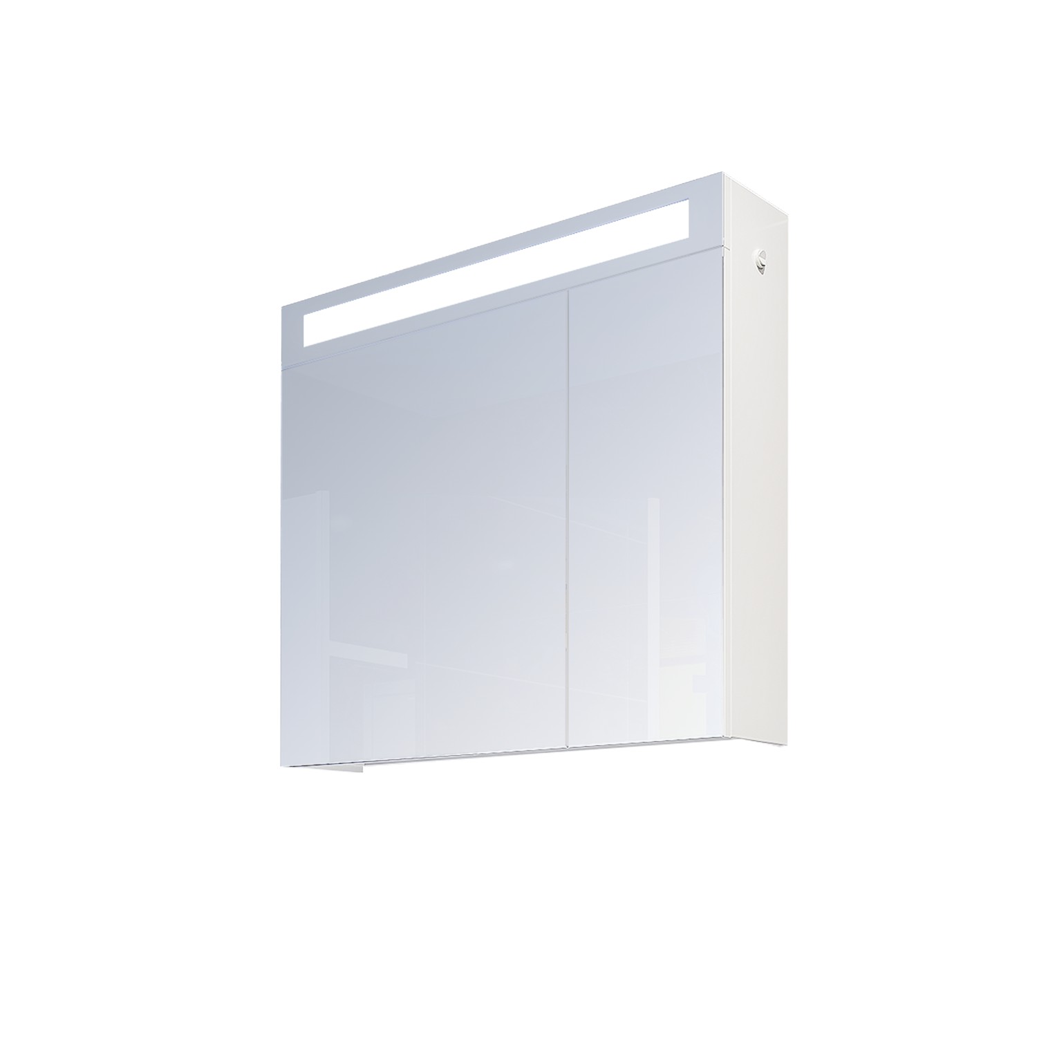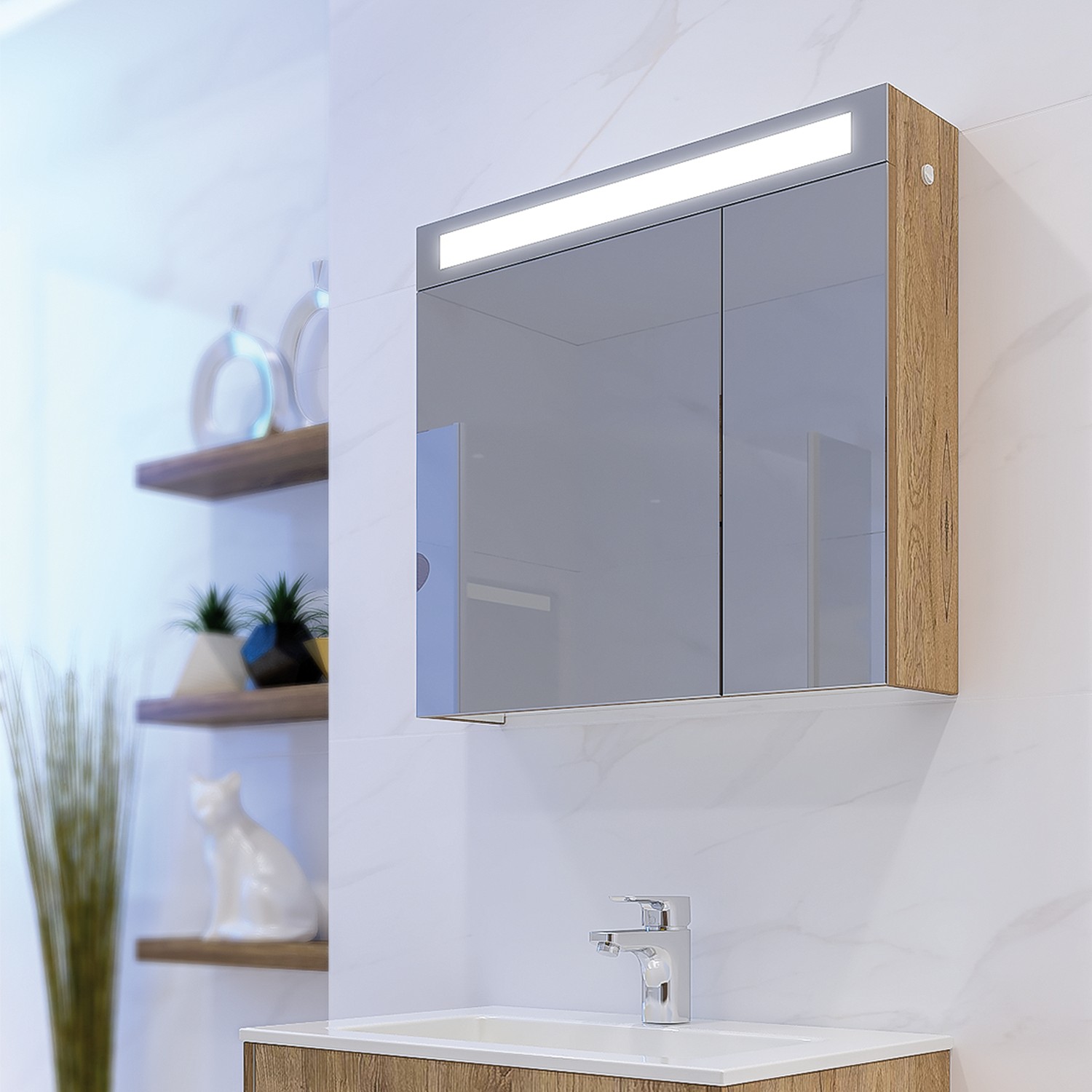 Практичен горен шкаф за баня с LED осветление. Две врати с огледало и един стъклен рафт, който функционално разпределя пространството за козметика и тоалетни принадлежности.