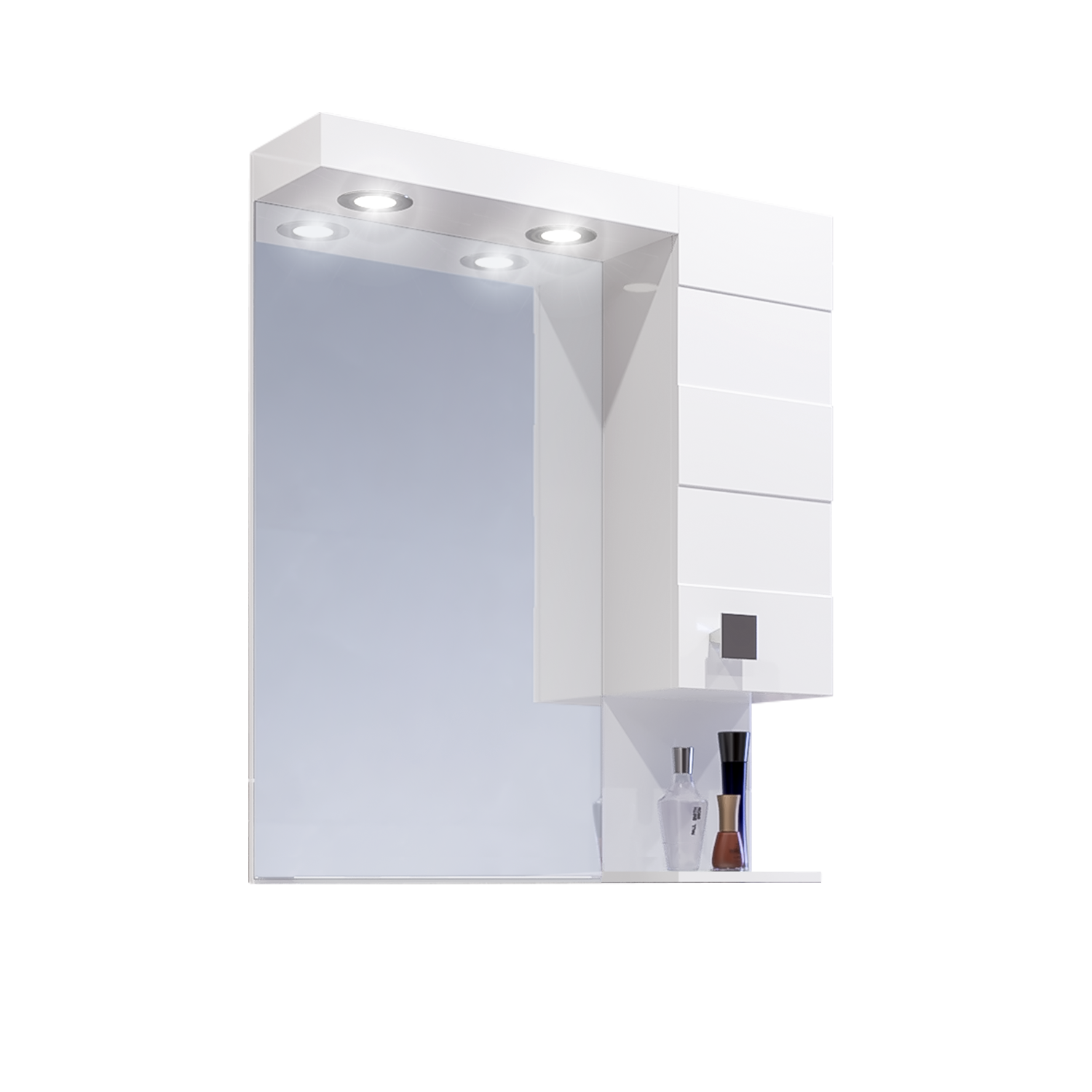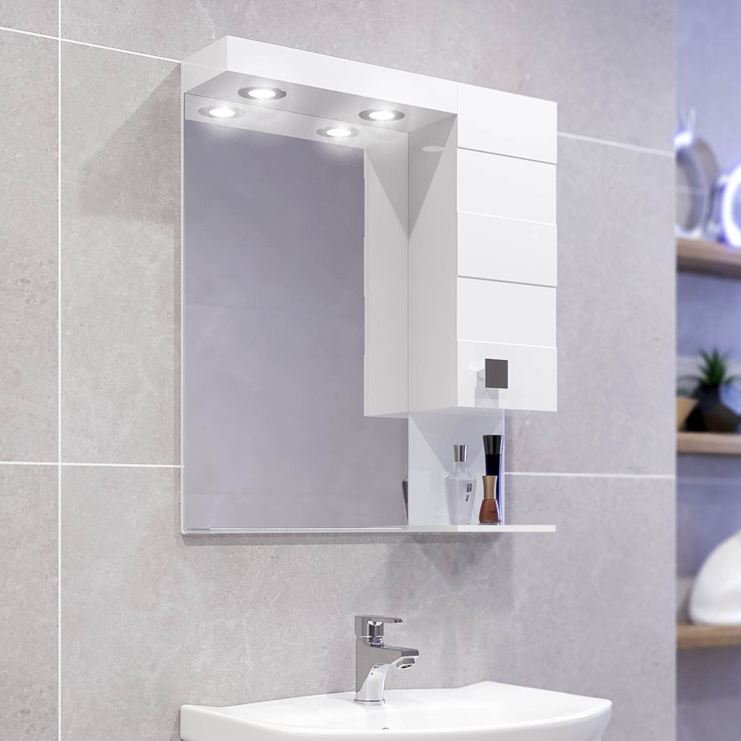 Практичен горен шкаф за баня с огледало с LED осветление и отделение с вратичка с декоративни елементи. Неподвижния PVC рафт предлага допълнително пространство за козметика и тоалетни принадлежности.