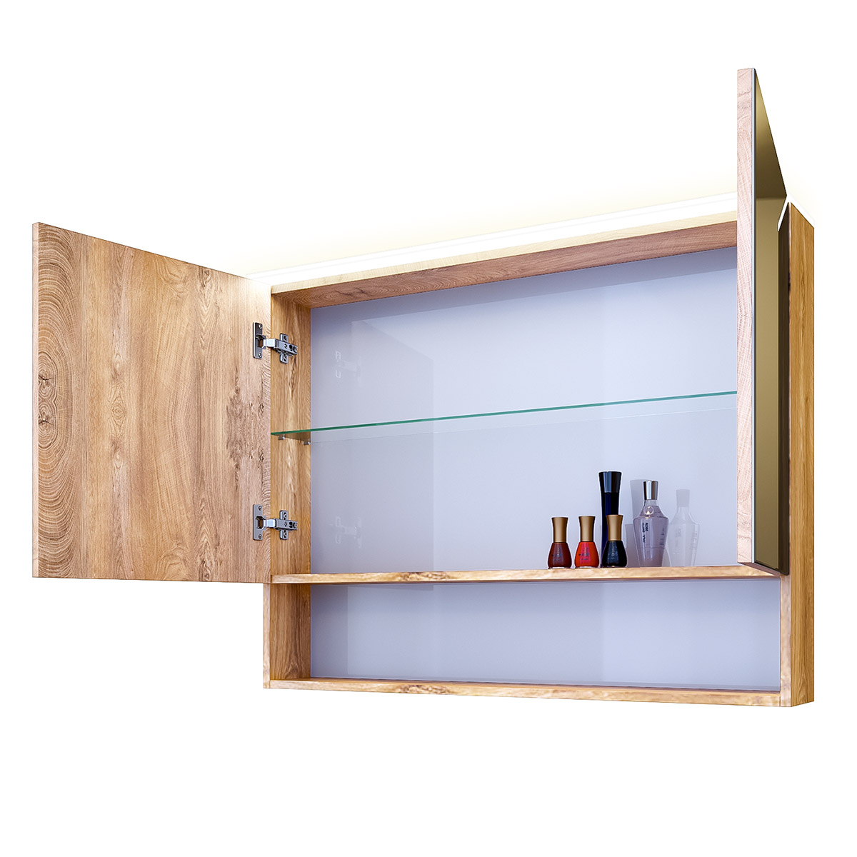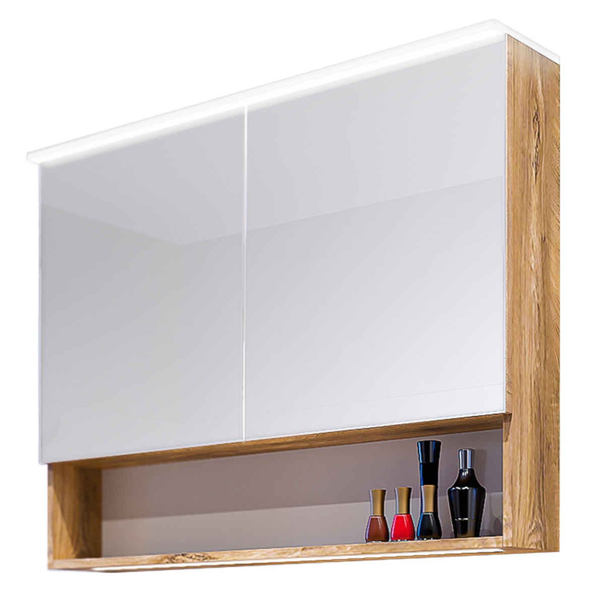 Практичен горен шкаф за баня с вградено LED осветление. Две врати с огледало и един стъклен рафт, който функционално разпределя пространството. Нишата предлага допълнитело място за козметика и тоалетни принадлежности.