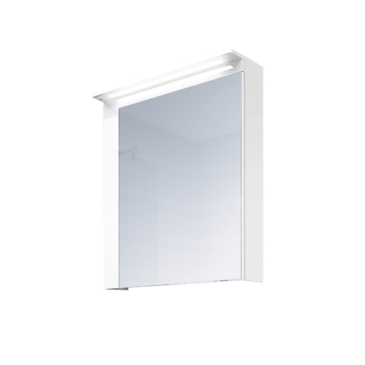 Практичен горен шкаф за баня с LED осветление. Eдна вратичка с огледало и един стъклен рафт, който функционално разпределя пространството за козметика и тоалетни принадлежности.