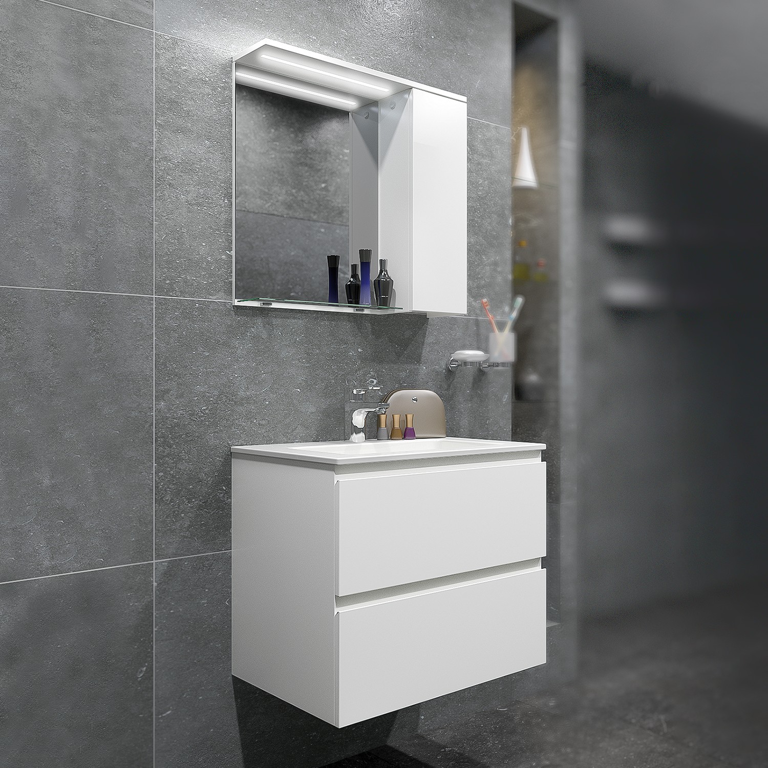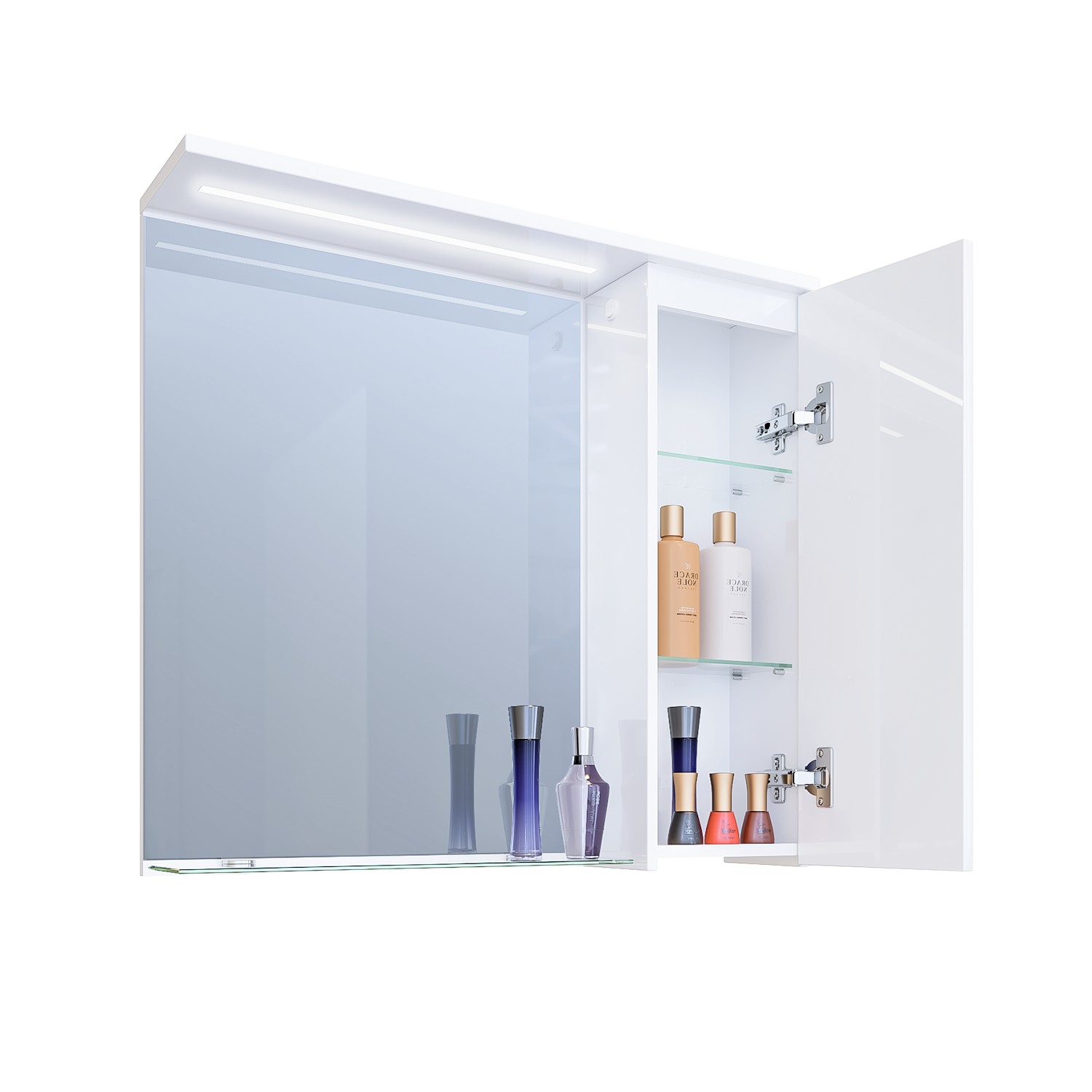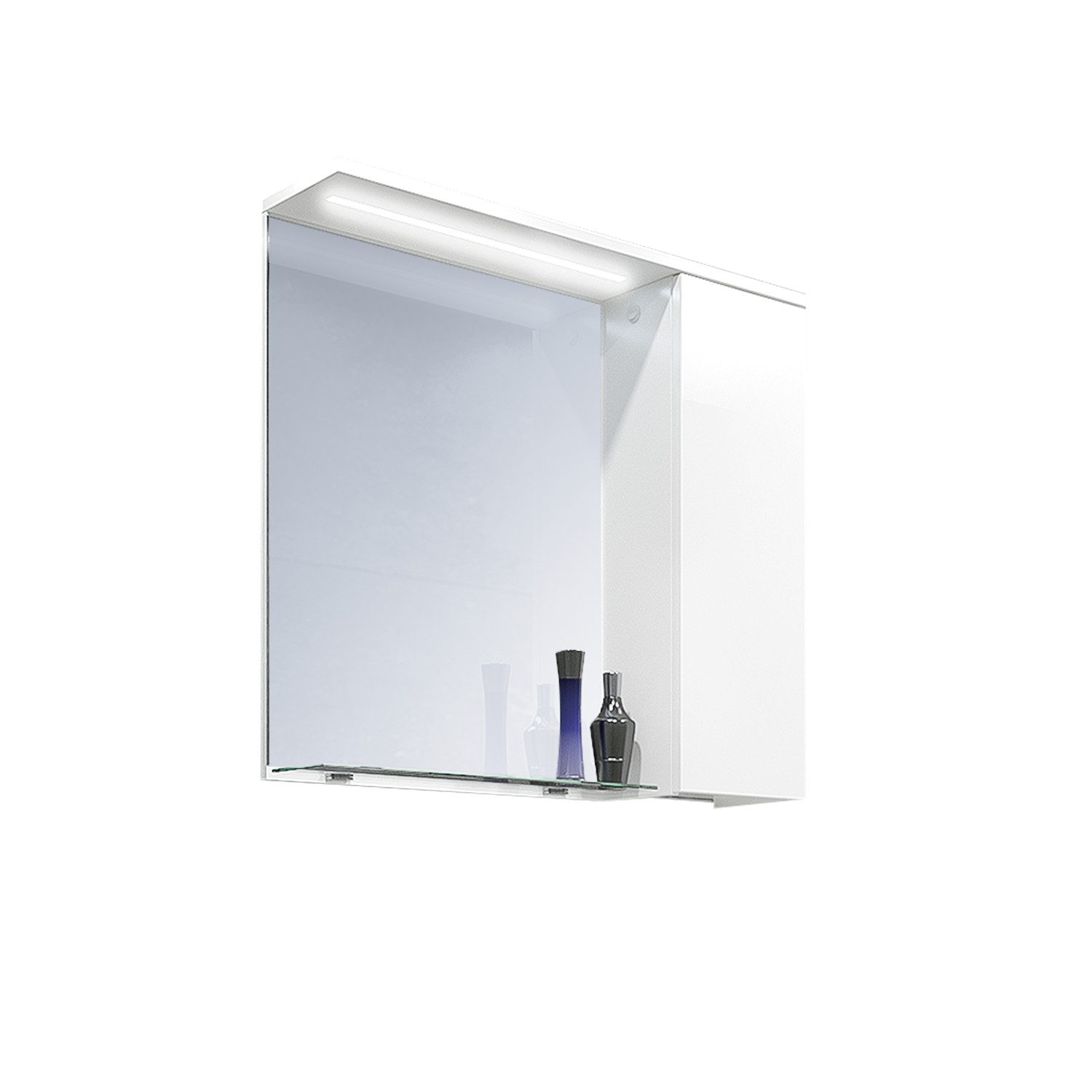 Практичен горен шкаф за баня с огледало с LED осветление и отделение с вратичка с декоративни елементи. Стъкленият рафт предлага допълнително пространство за козметика и тоалетни принадлежности.
