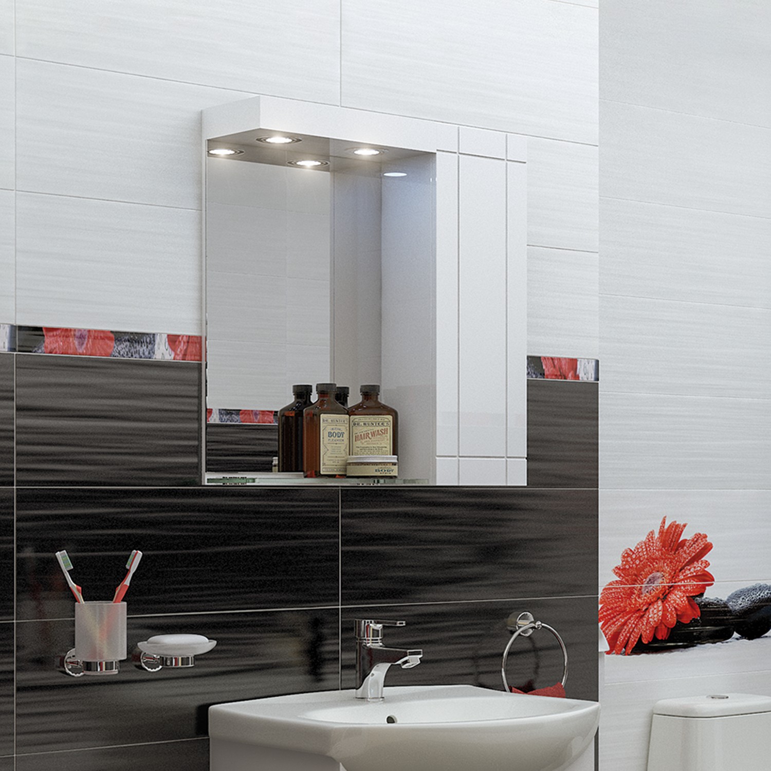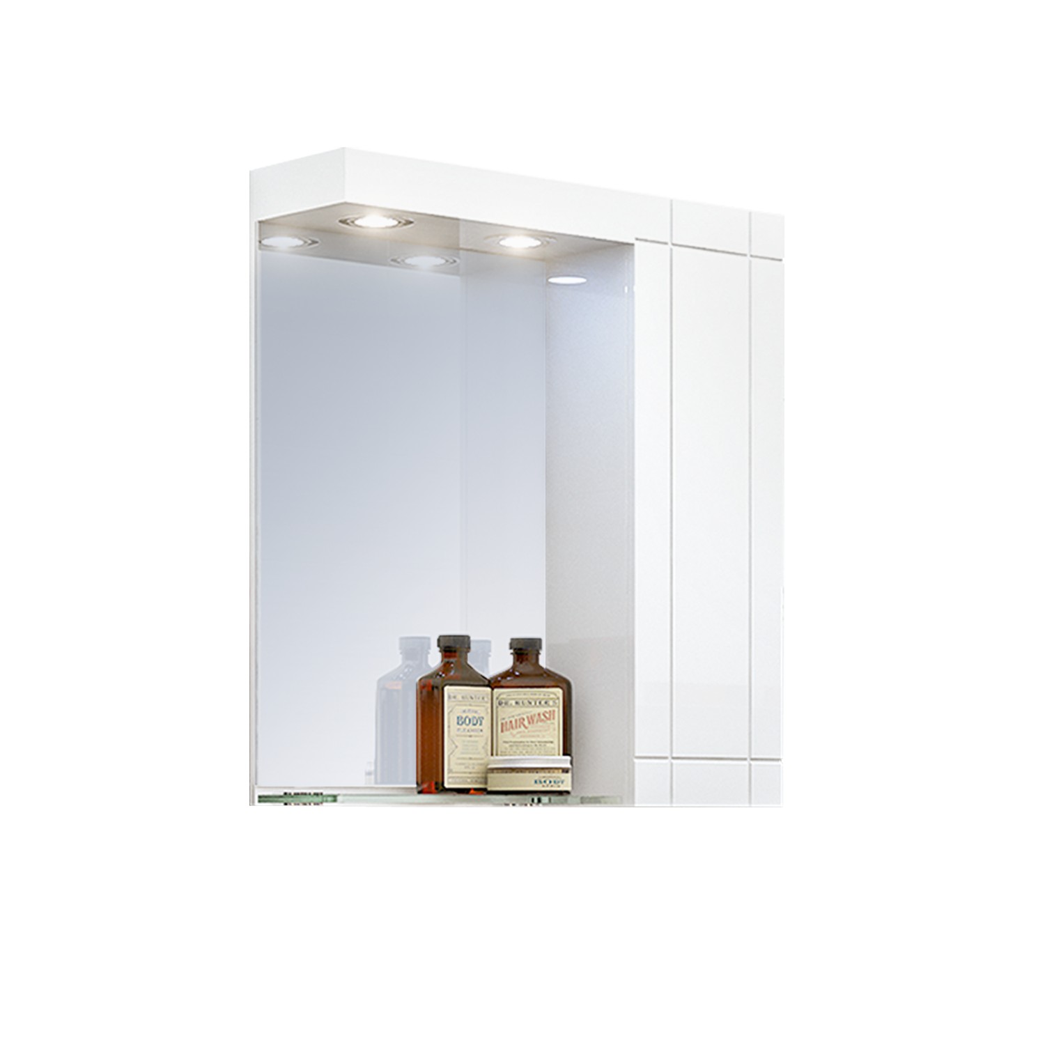 Практичен горен шкаф за баня с огледало с LED осветление и отделение с вратичка с декоративни елементи. Стъкленият рафт предлага допълнително пространство за козметика и тоалетни принадлежности.