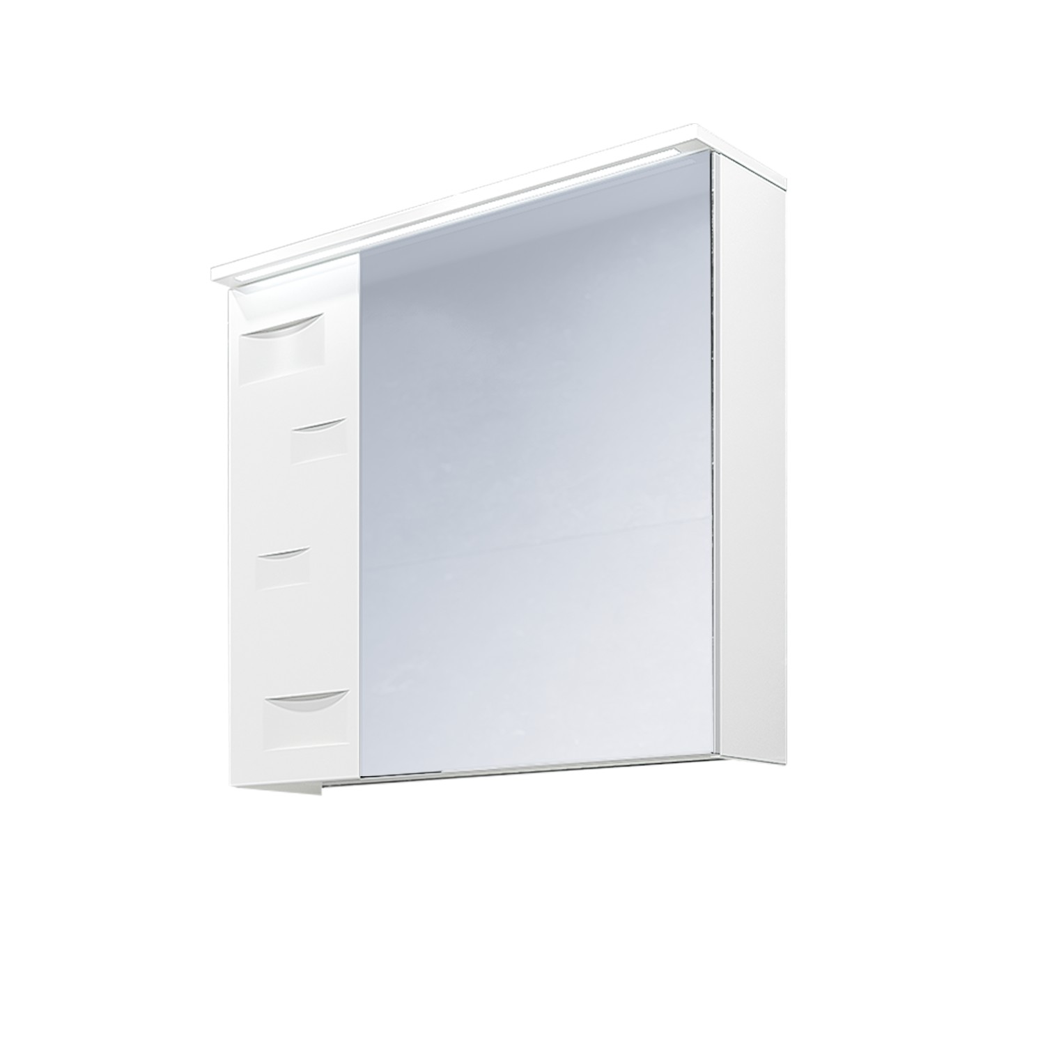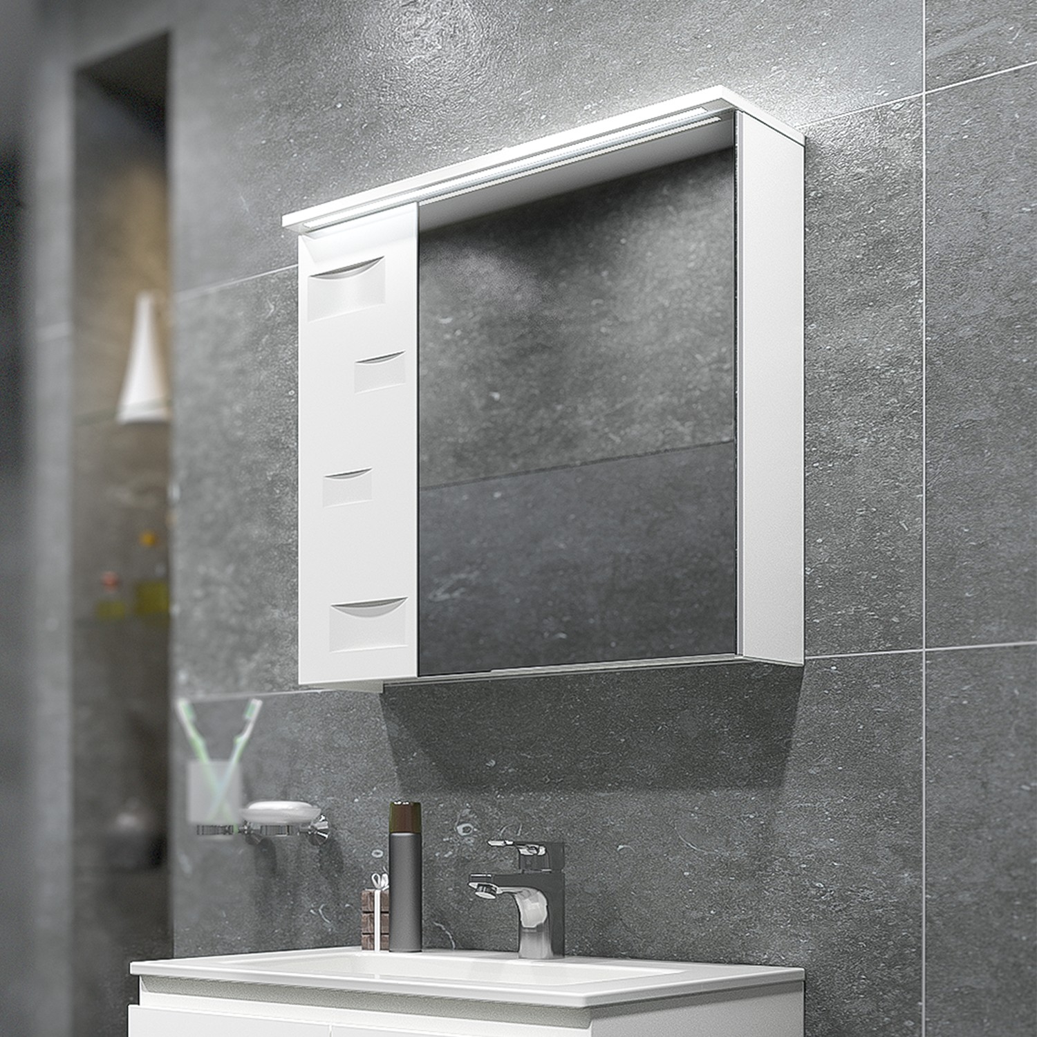Практичен горен шкаф за баня с LED осветление. Две врати с огледало и два стъклени рафта, които функционално разпределят пространството за козметика и тоалетни принадлежности.
