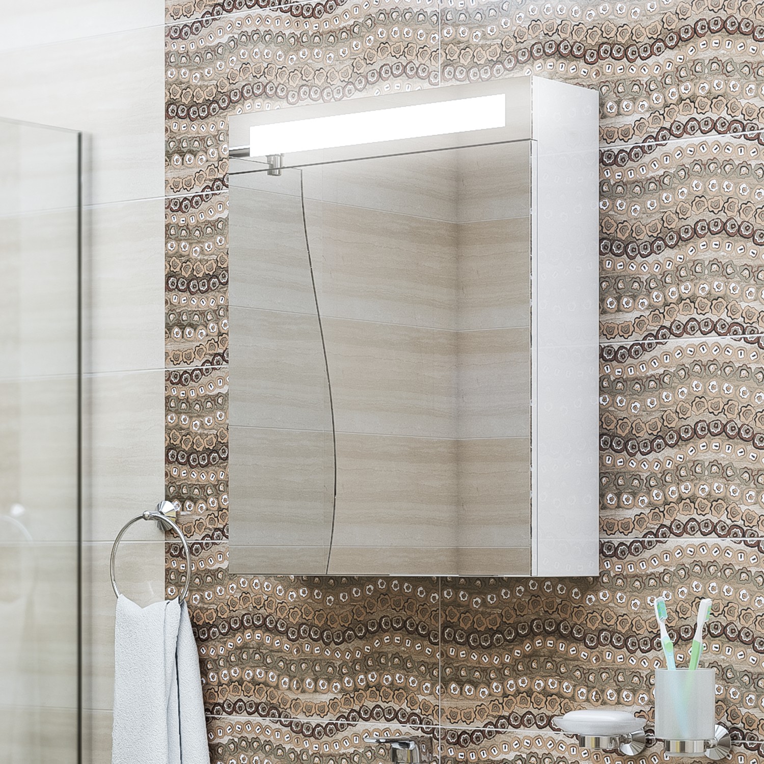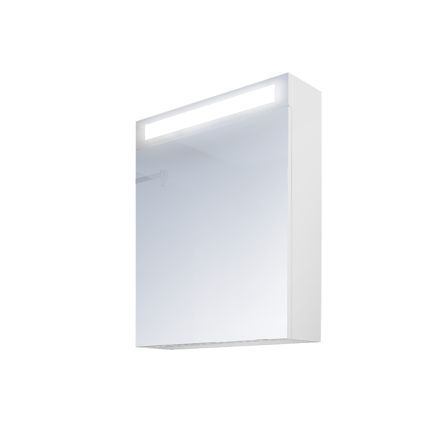 Практичен горен шкаф за баня с LED осветление. Eдна вратичка с огледало и един стъклен рафт, който функционално разпределя пространството за козметика и тоалетни принадлежности.
