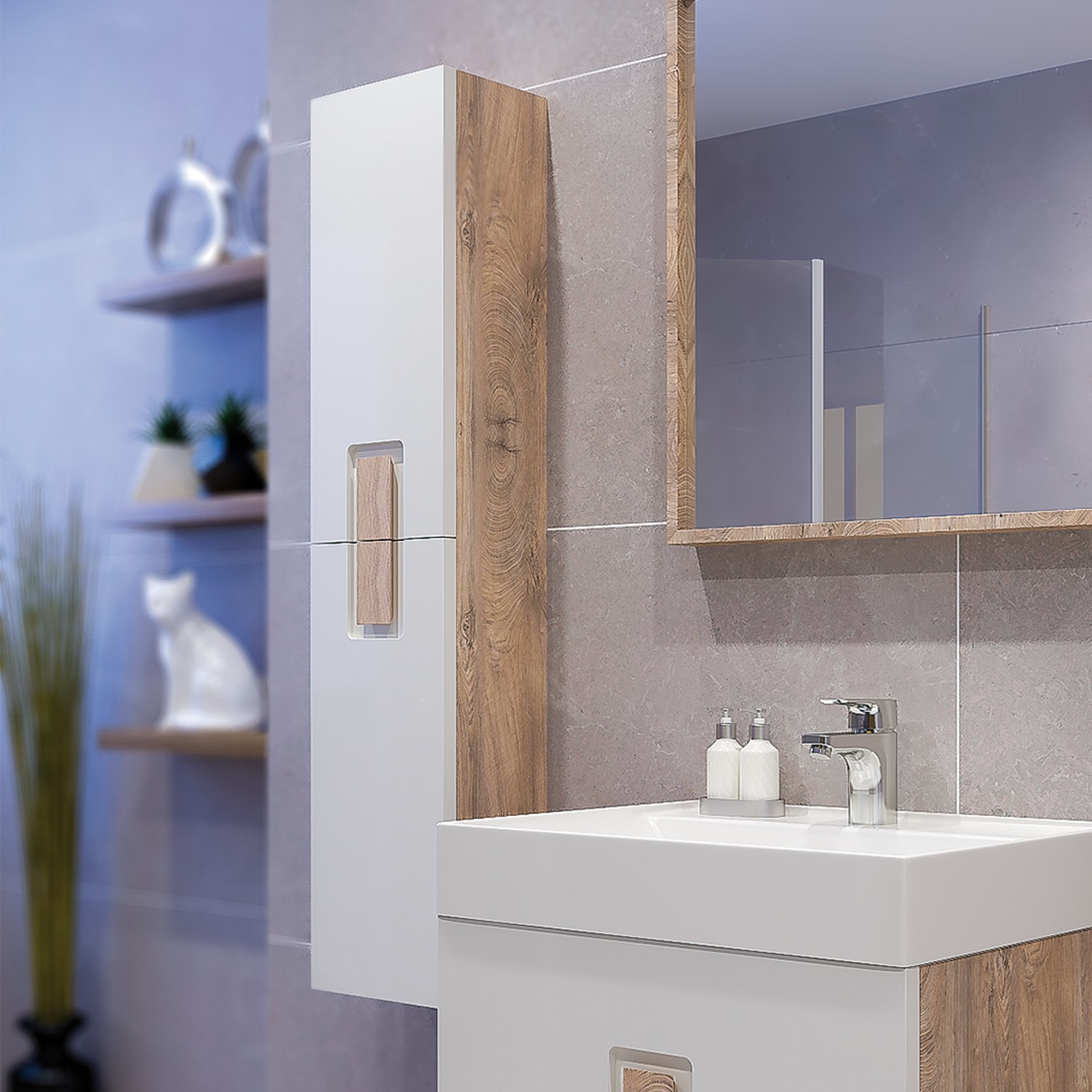 Стилно допълнение към вашата баня с модерни дървесни акценти. Водоустойчива колона с две врати с плавно затваряне и два стъклени рафта, които предлагат много пространство за съхранение на козметика и тоалетни принадлежности.