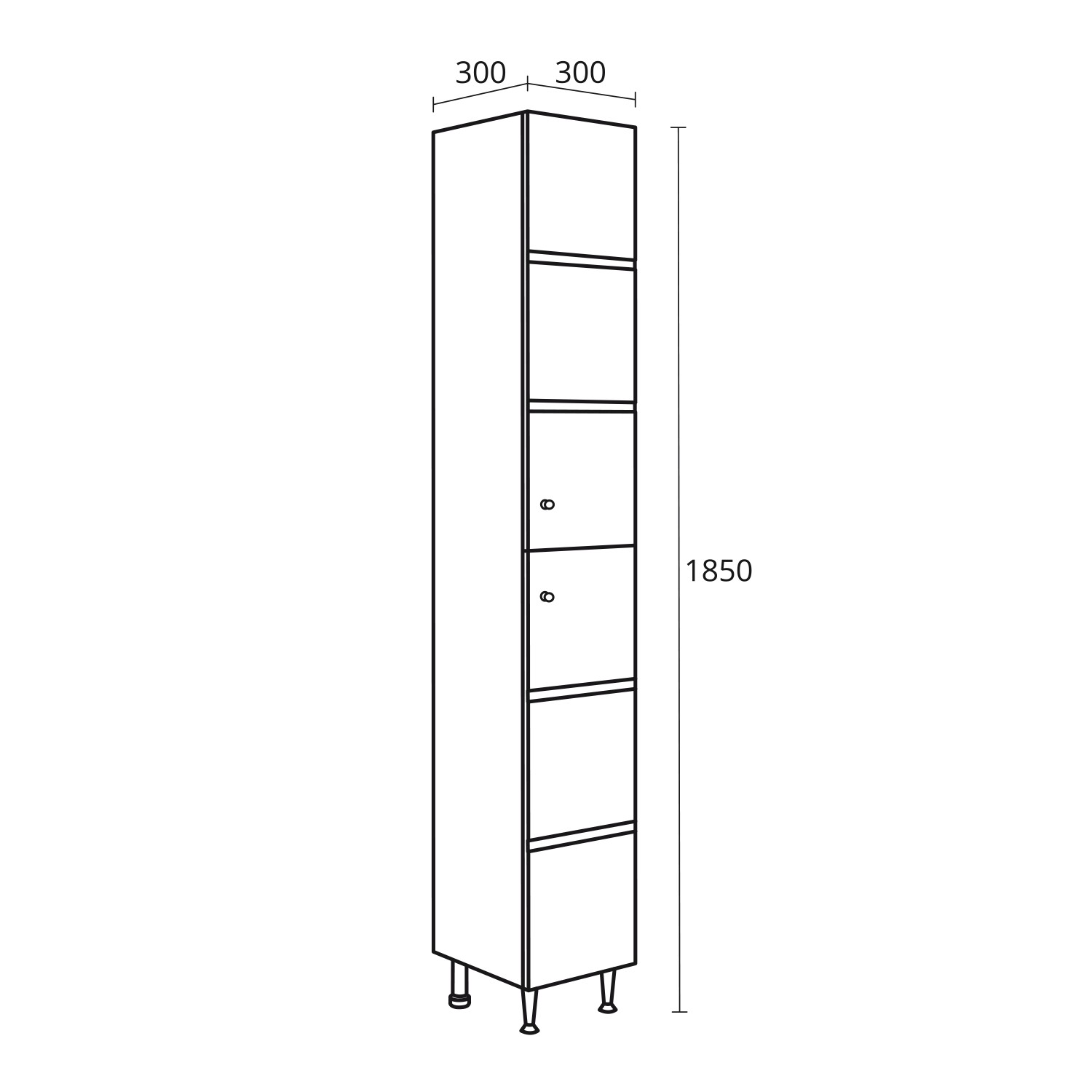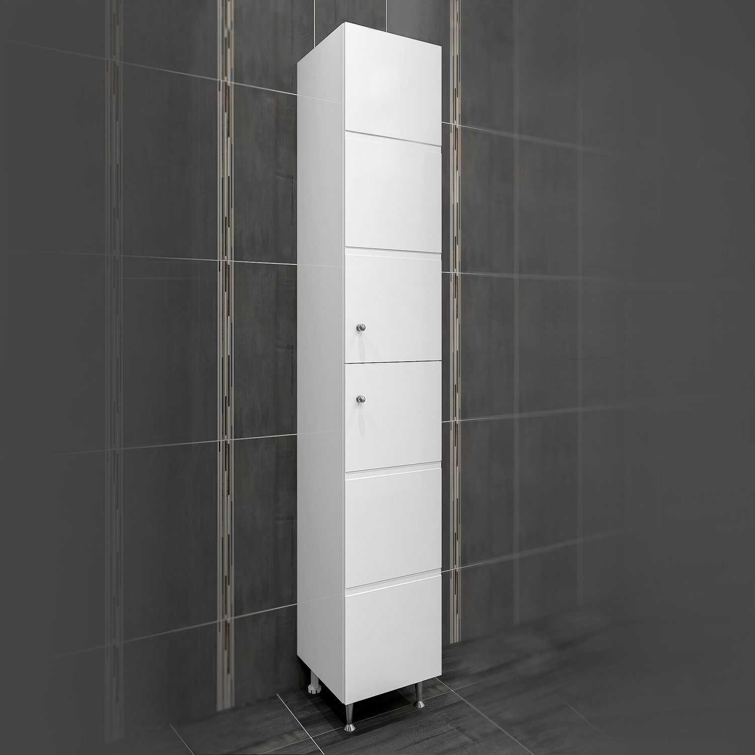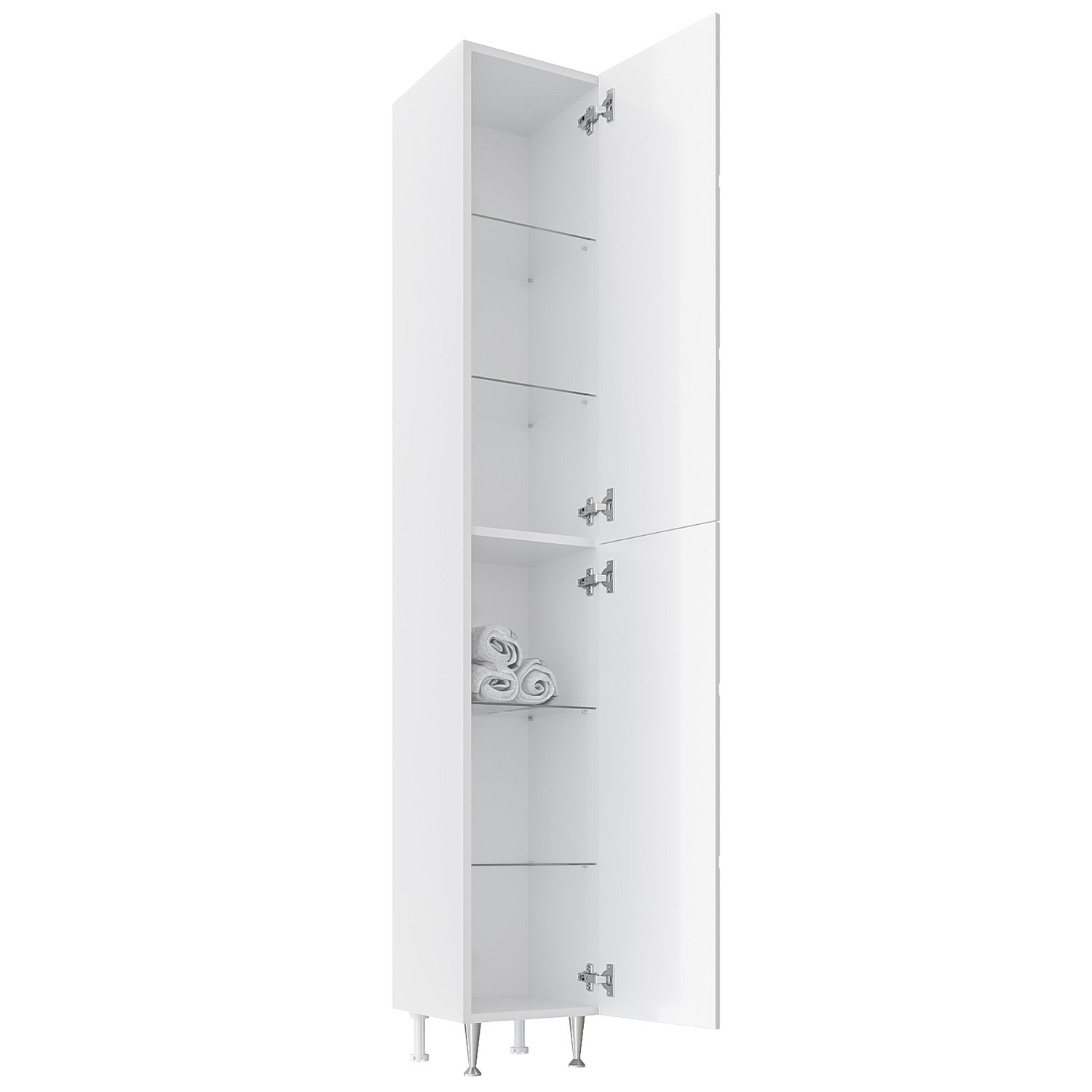 Водоустойчива колона за баня с две врати с декоративни елементи и плавно затваряне. Четирите стъклени рафта предлагат много пространство за съхранение на козметика и тоалетни принадлежности.