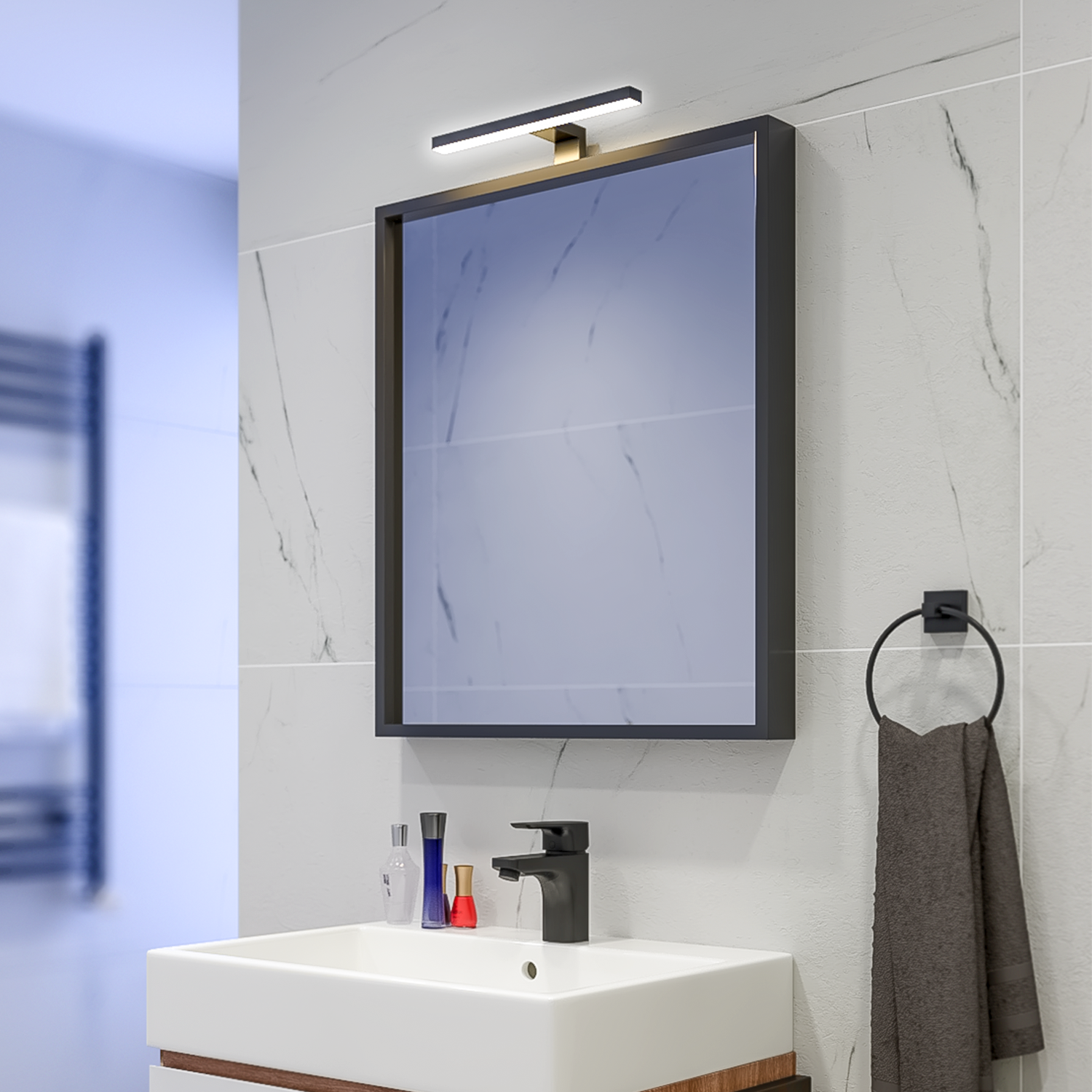 Стилно огледало в черен мат с LED осветление, изработено върху водоустойчива PVC рамка.