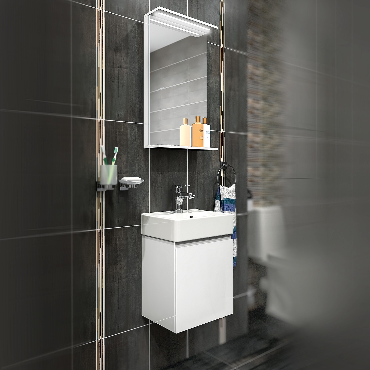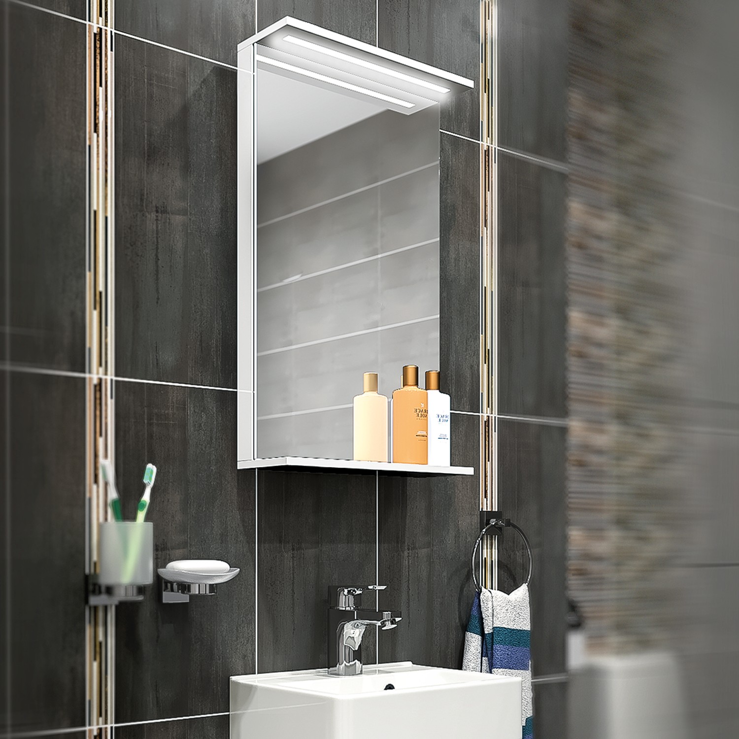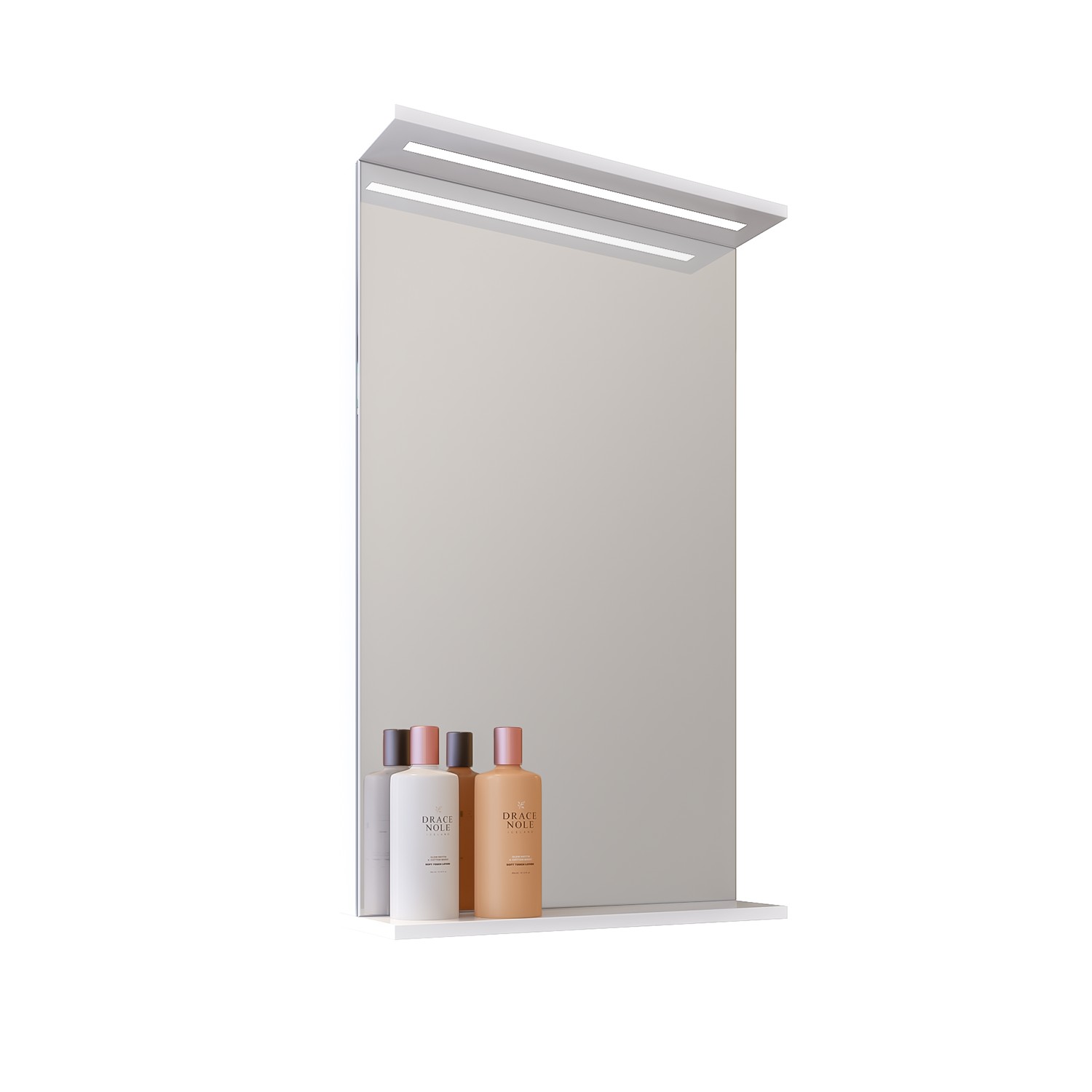 Огледало за баня с водоустойчива PVC основа и рафт и вградено LED осветление.