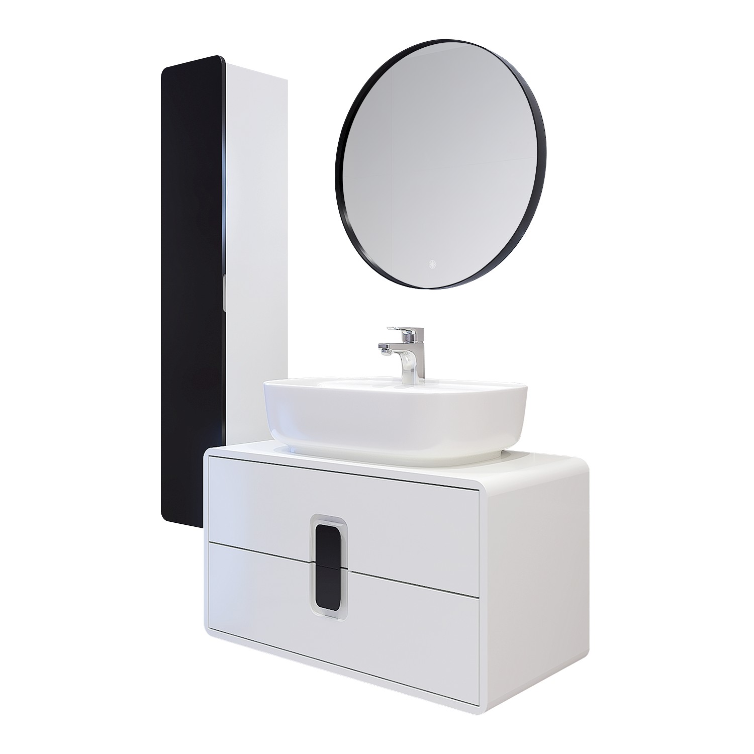 Съвършено водоустойчив комплект шкафове за вашата баня. С две елегантни чекмеджета с плавно затваряне, модерно кръгло огледало с LED осветление и практична колона, която предоставя много място за съхранение.