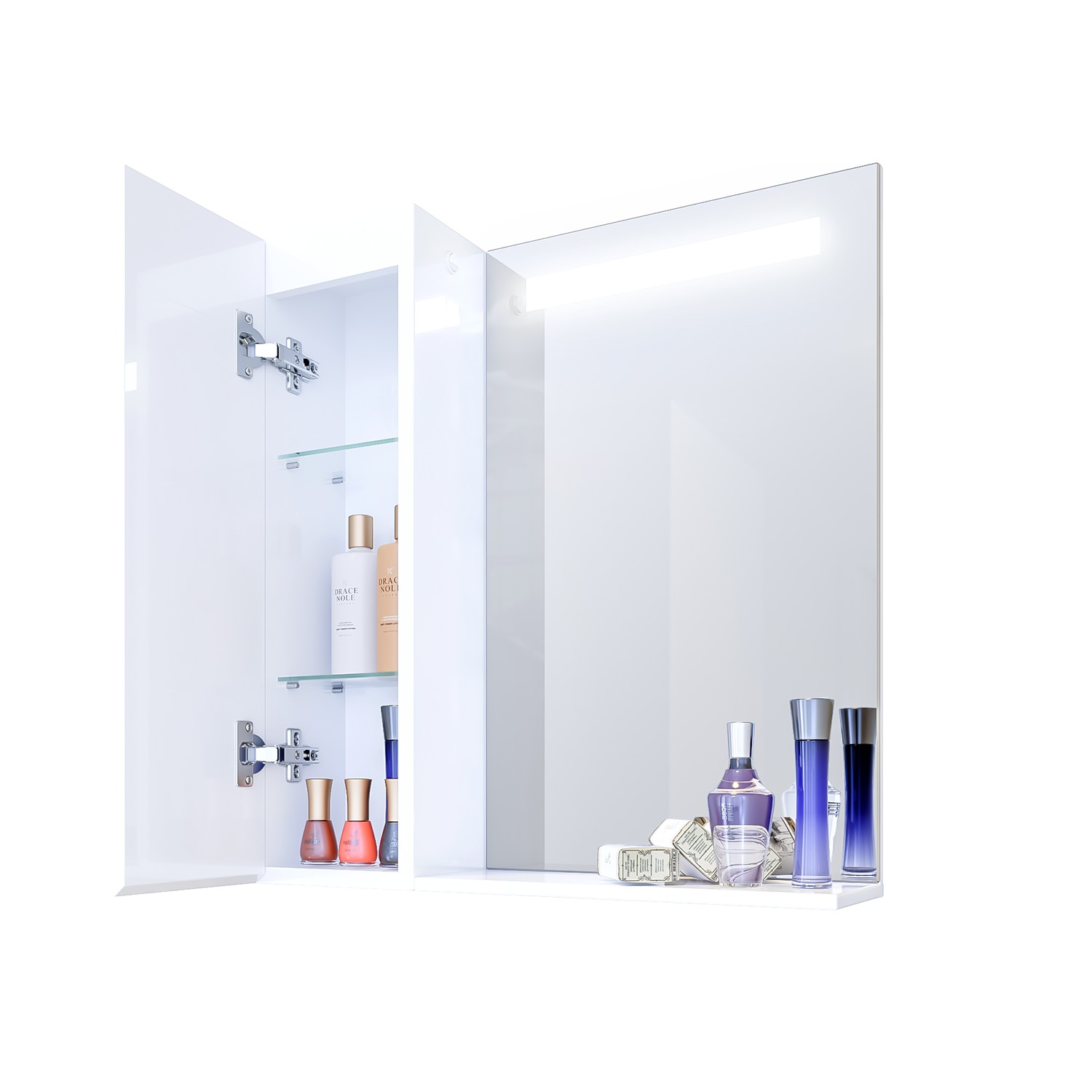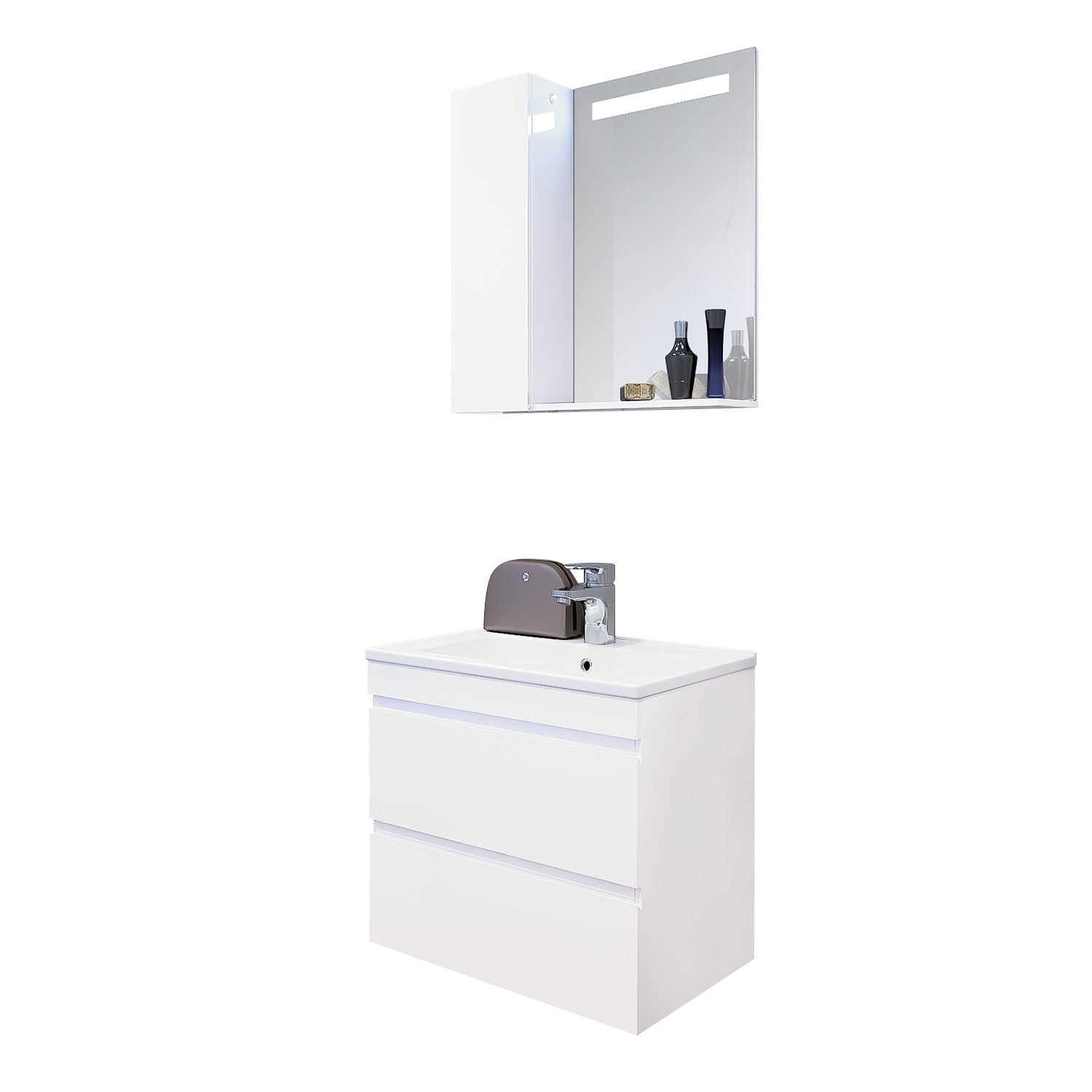 Добавете стил във вашата баня с този компактен и удобен водоустойчив комплект шкафове. Две практични чекмеджета с плавно затваряне и горен шкаф с огледало и LED осветление.