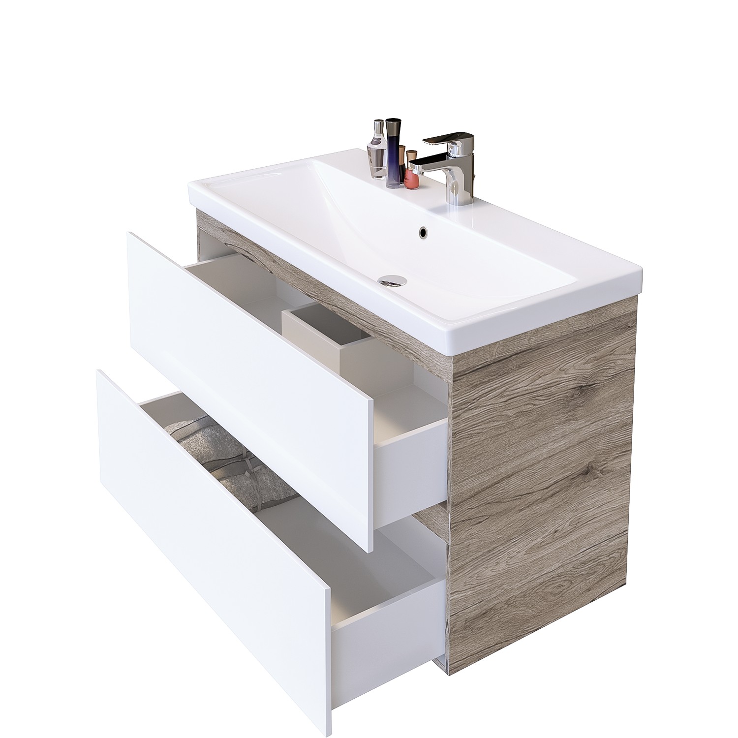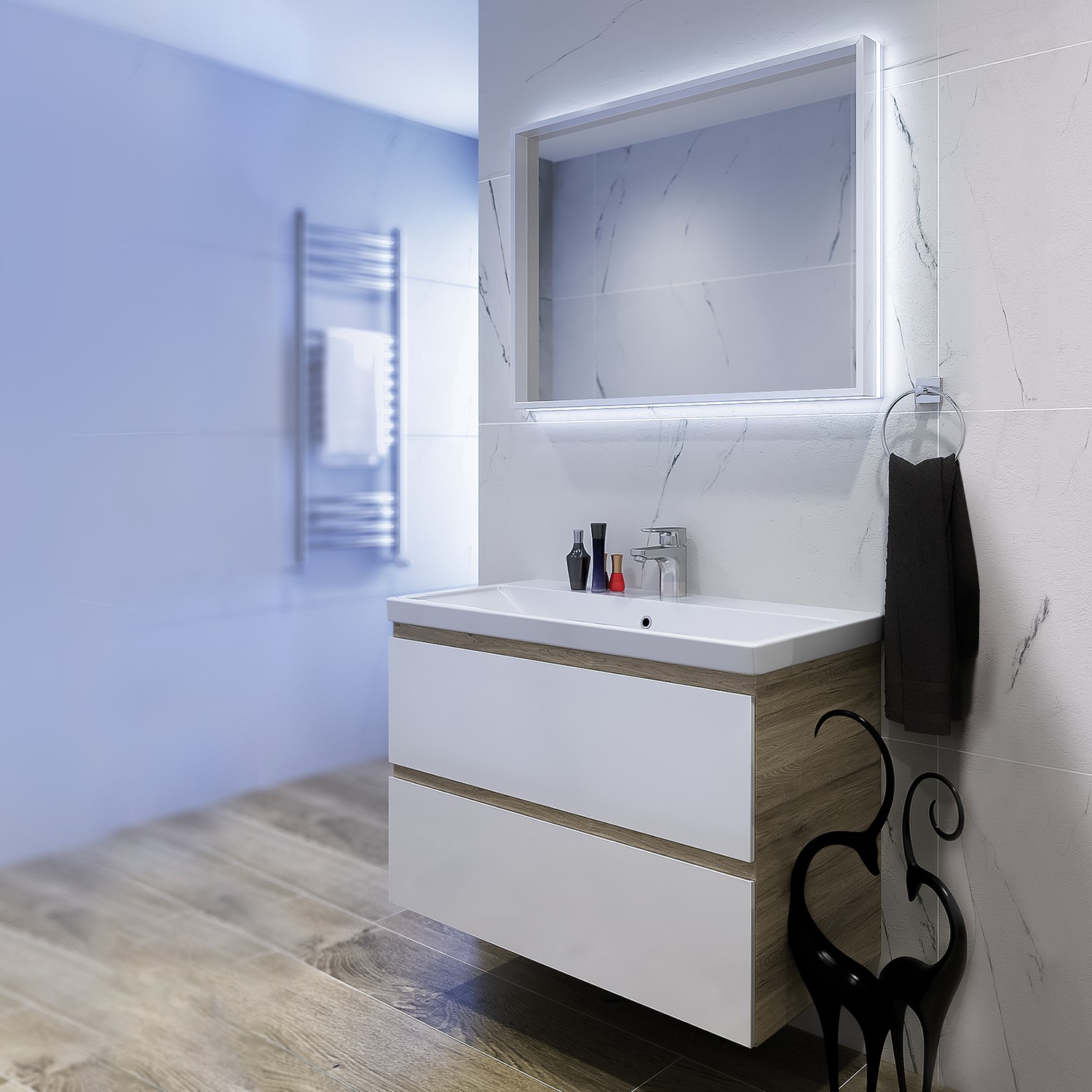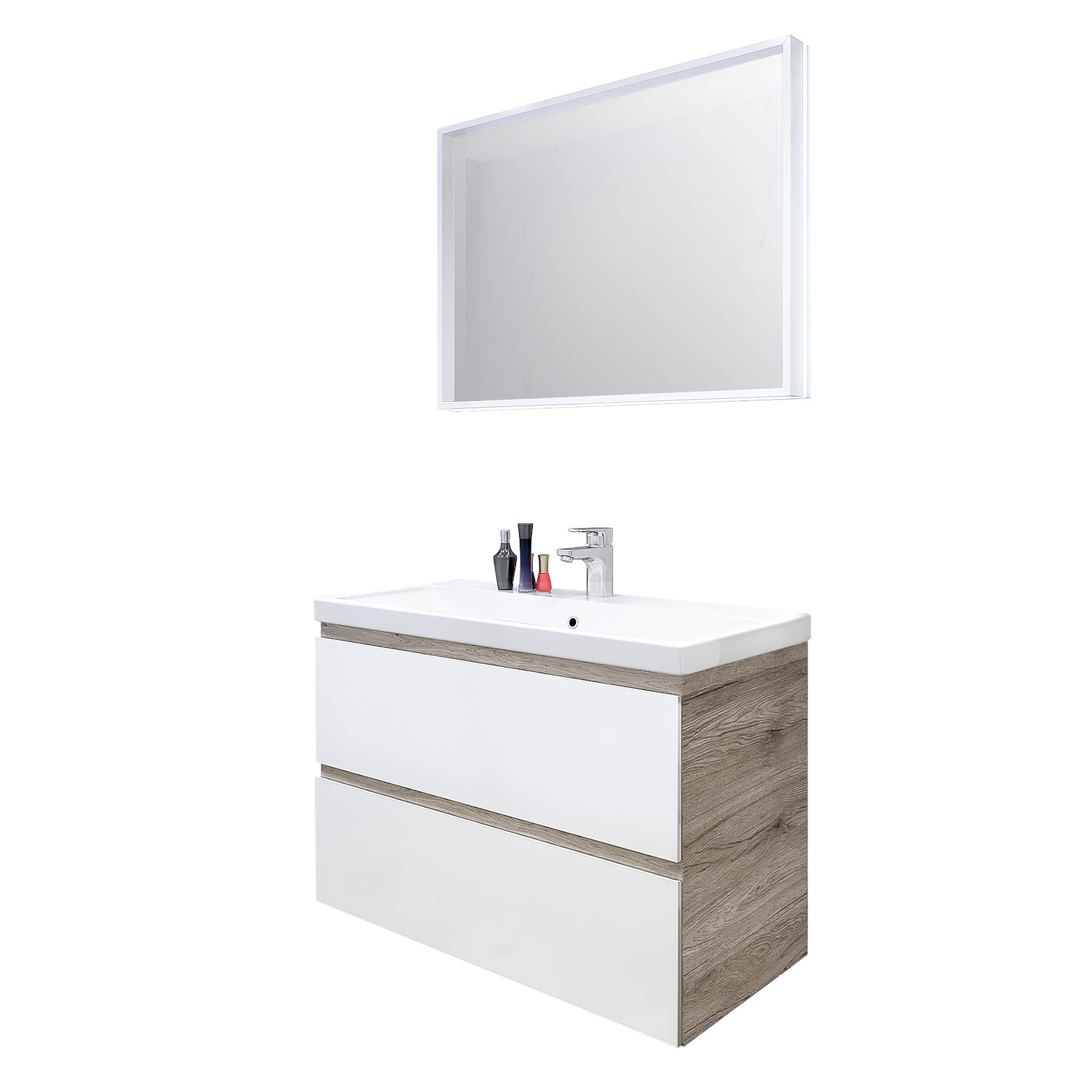 Съвършено водоустойчив комплект шкафове за вашата баня в модерен дървесен цвят с две удобни чекмеджета и голямо огледало с LED осветление.
