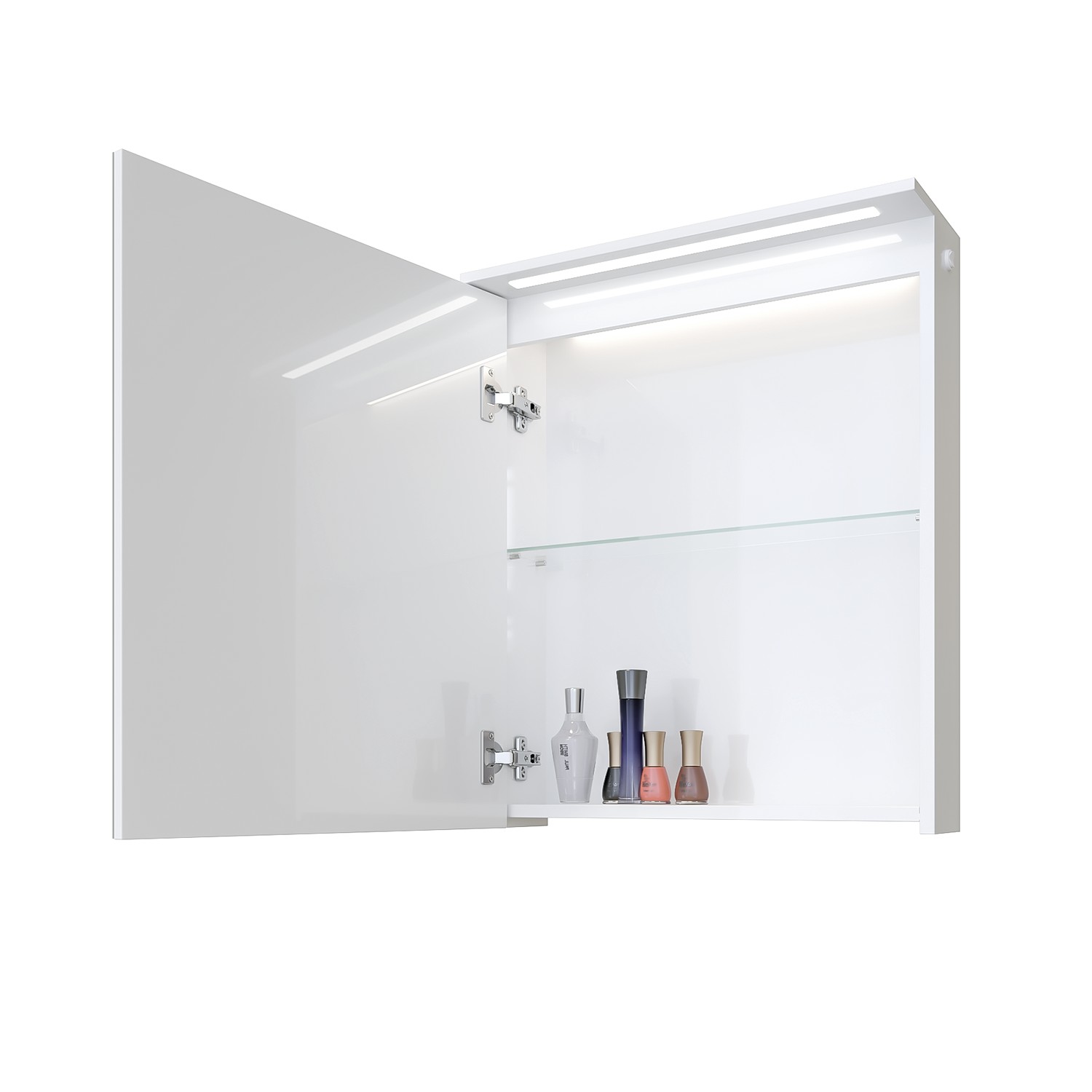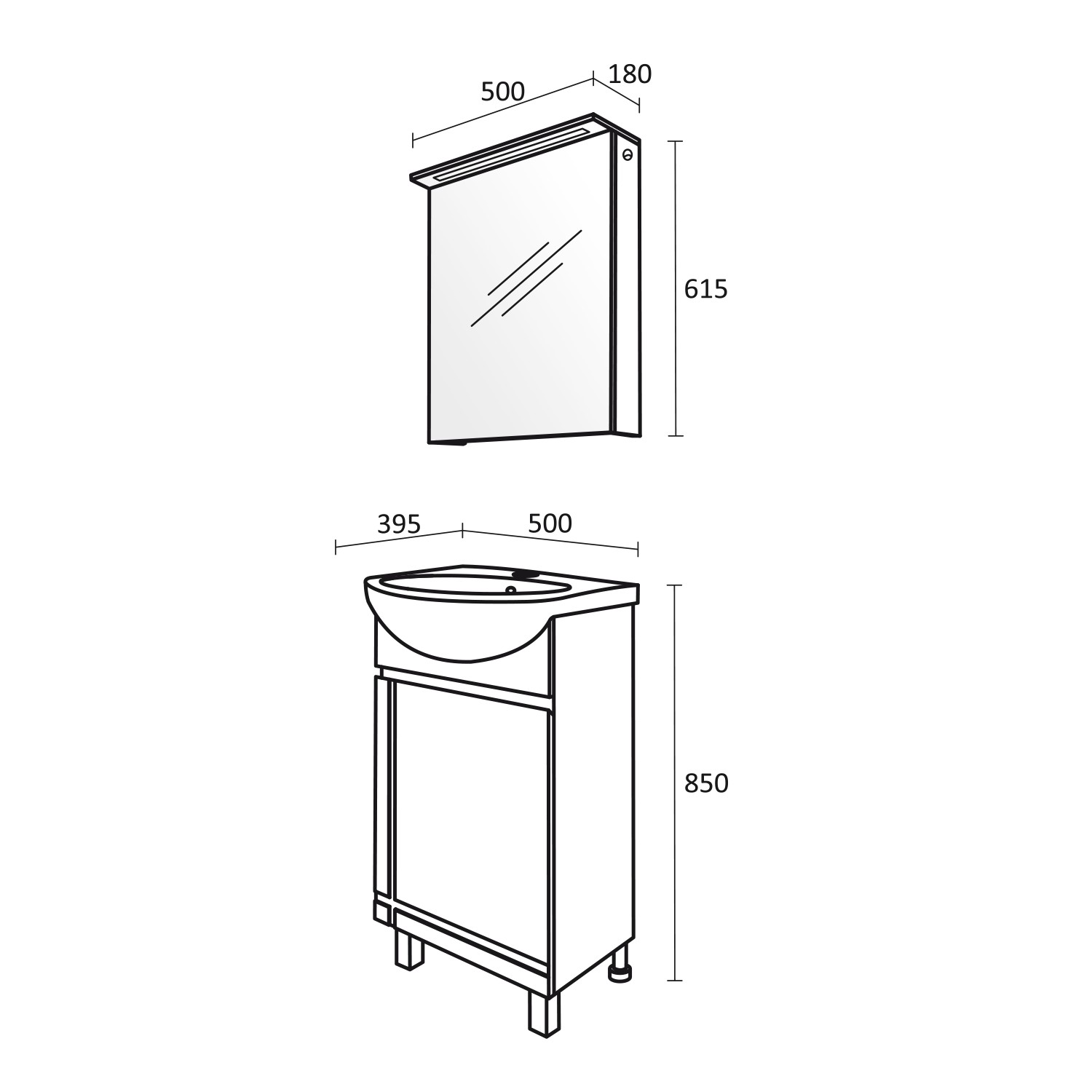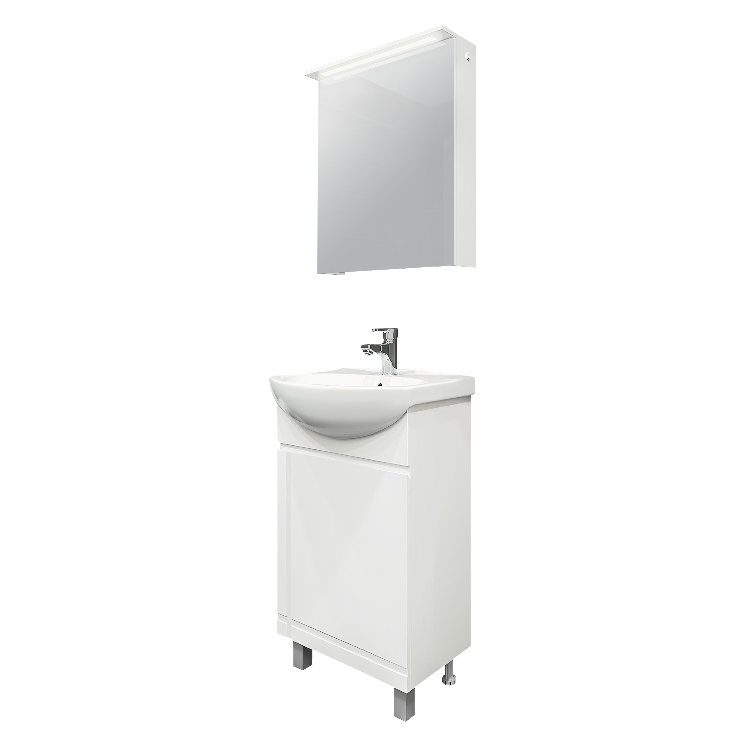 Компактен водоустойчив комплект шкафове с една врата и плавно затваряне и горен шкаф с огледало и LED осветление. Подходящ за малки помещения.