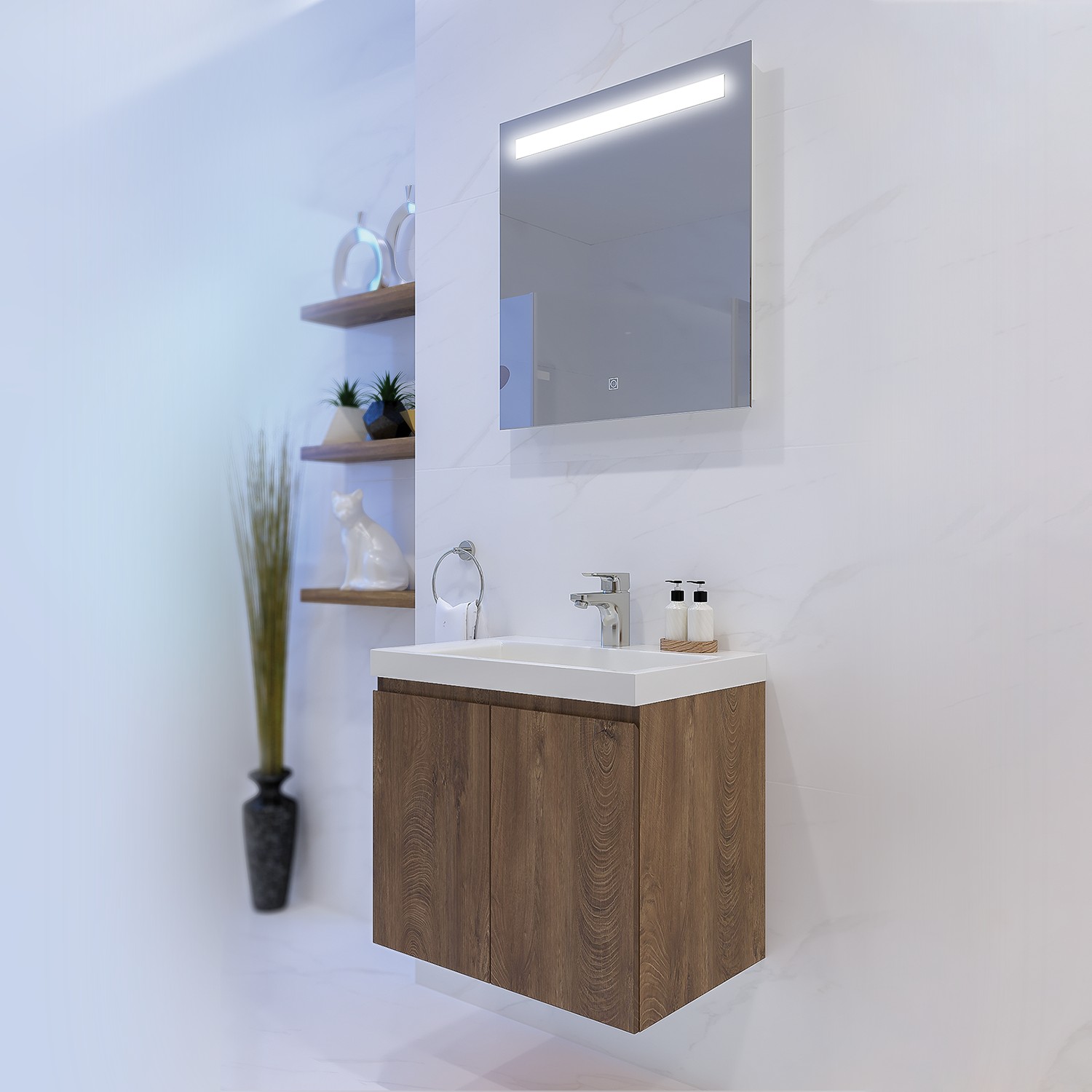 Стилен и практичен водоустойчив комплект шкафове в модерен дървесен цвят! Включва огледало с LED осветление.