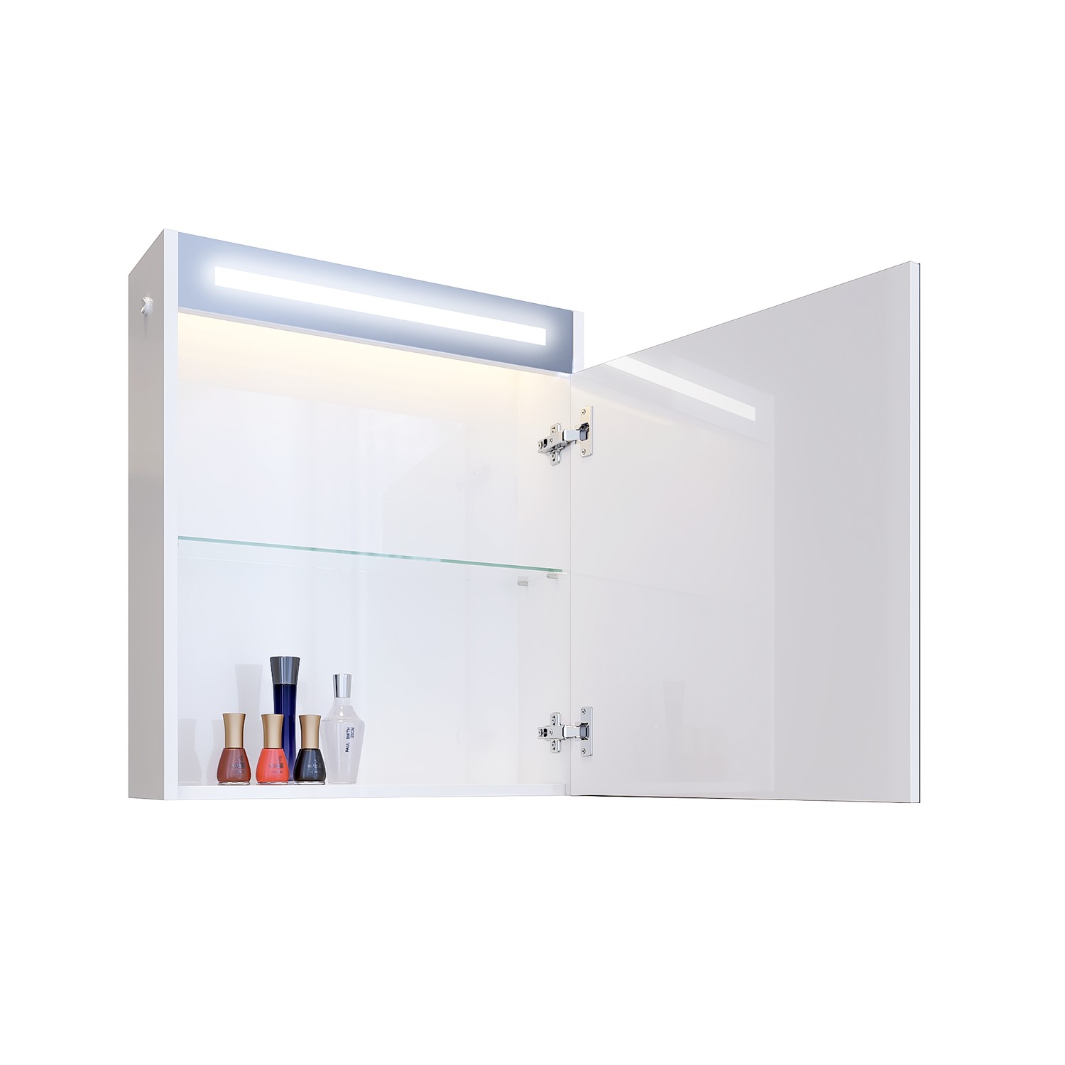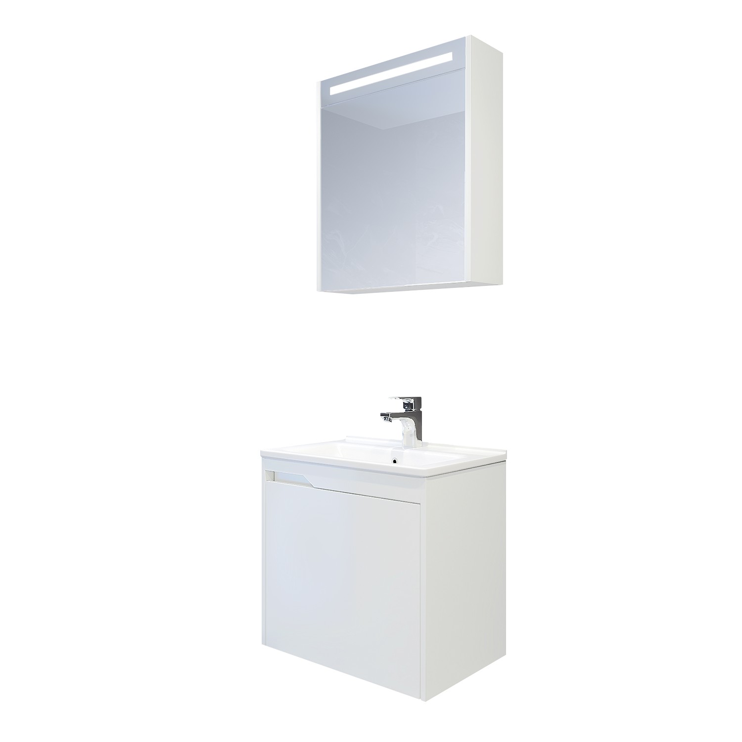 Добавете стил във вашата баня с този компактен и удобен водоустойчив комплект шкафове. Една врата с плавно затваряне, кръгла мивка и горен шкаф с огледало и LED осветление.