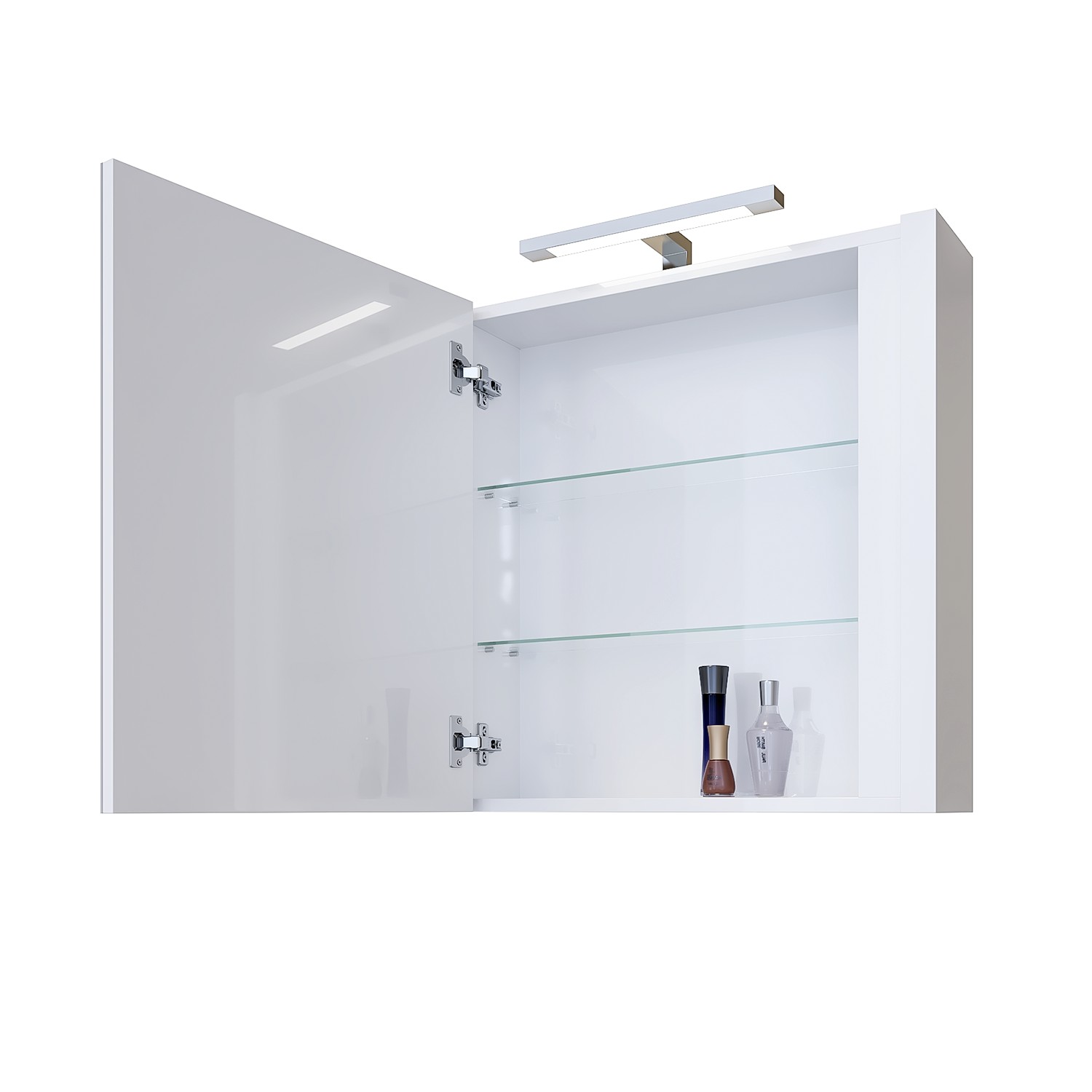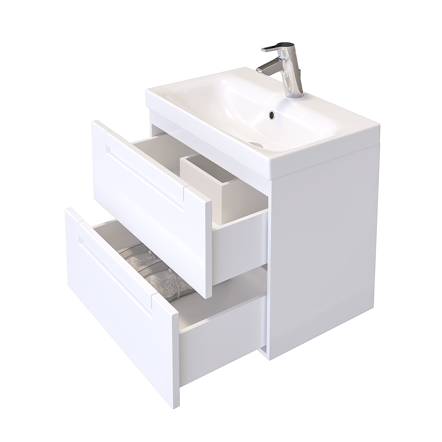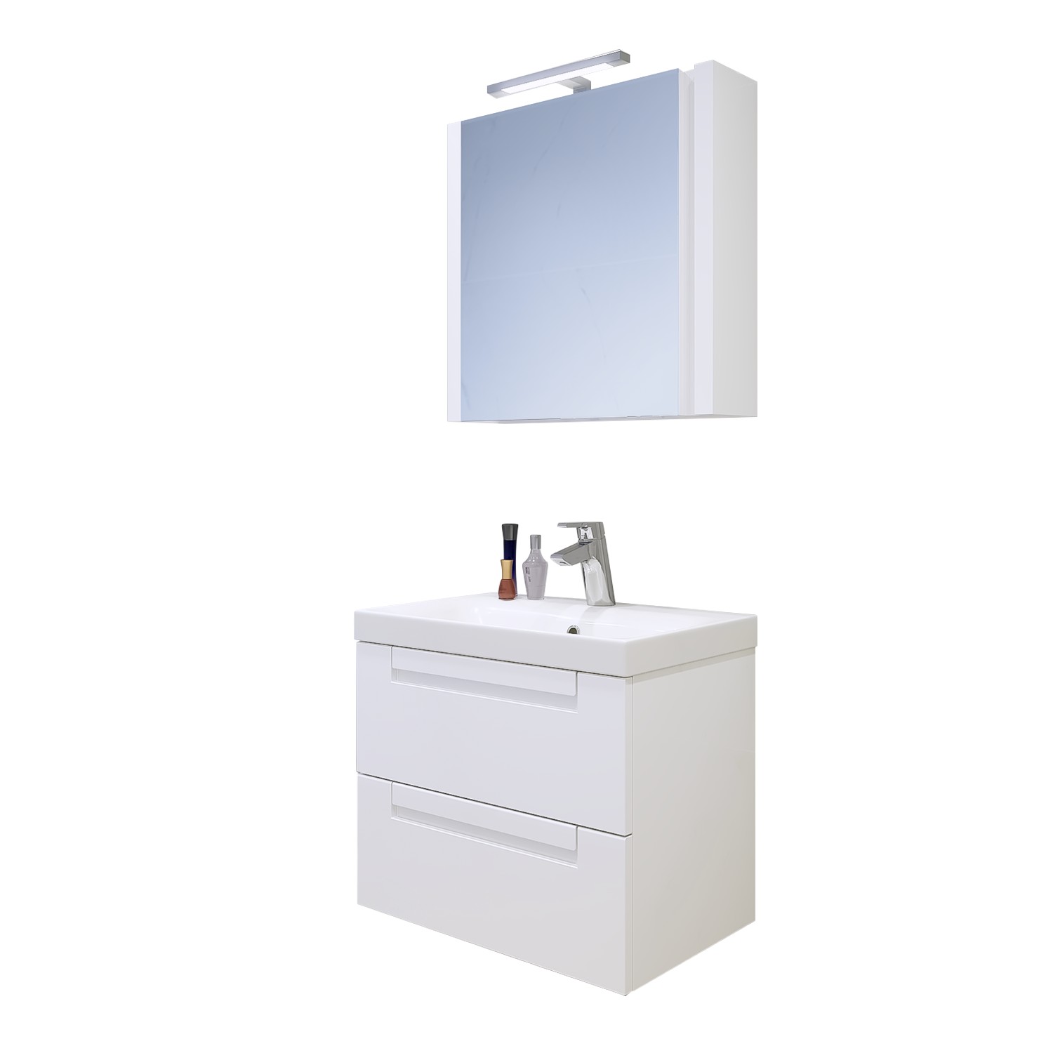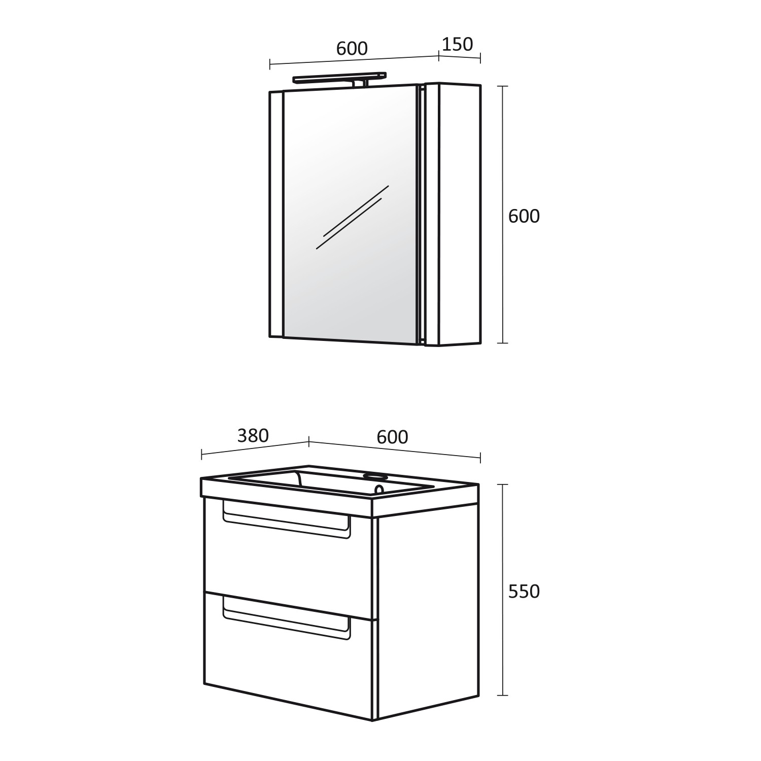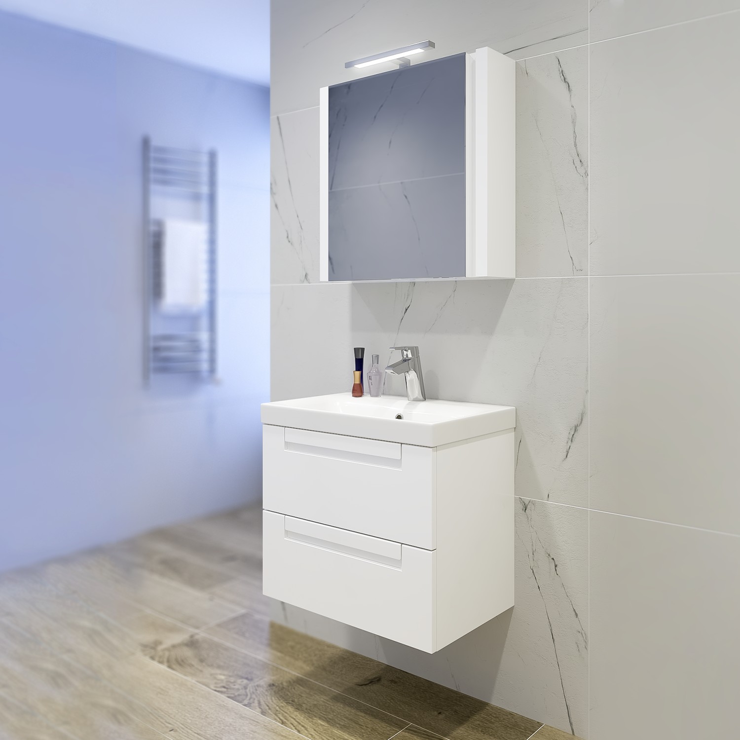 Стилен водоустойчив комплект шкафове с две практични чекмеджета и плавно затваряне! Горният шкаф с LED осветление предоставя допълнително място за съхранение.