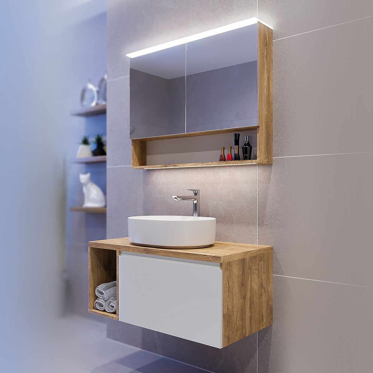 Стилен шкаф с модерна комбинация от дървесен цвят и бяло, който предлага много пространство за съхранение с дълбоко чекмедже и допълнителна ниша. Елегантната порцеланова мивка върху плота и горния шкаф с огледало и вградено LED осветление завършват перфектно визията.