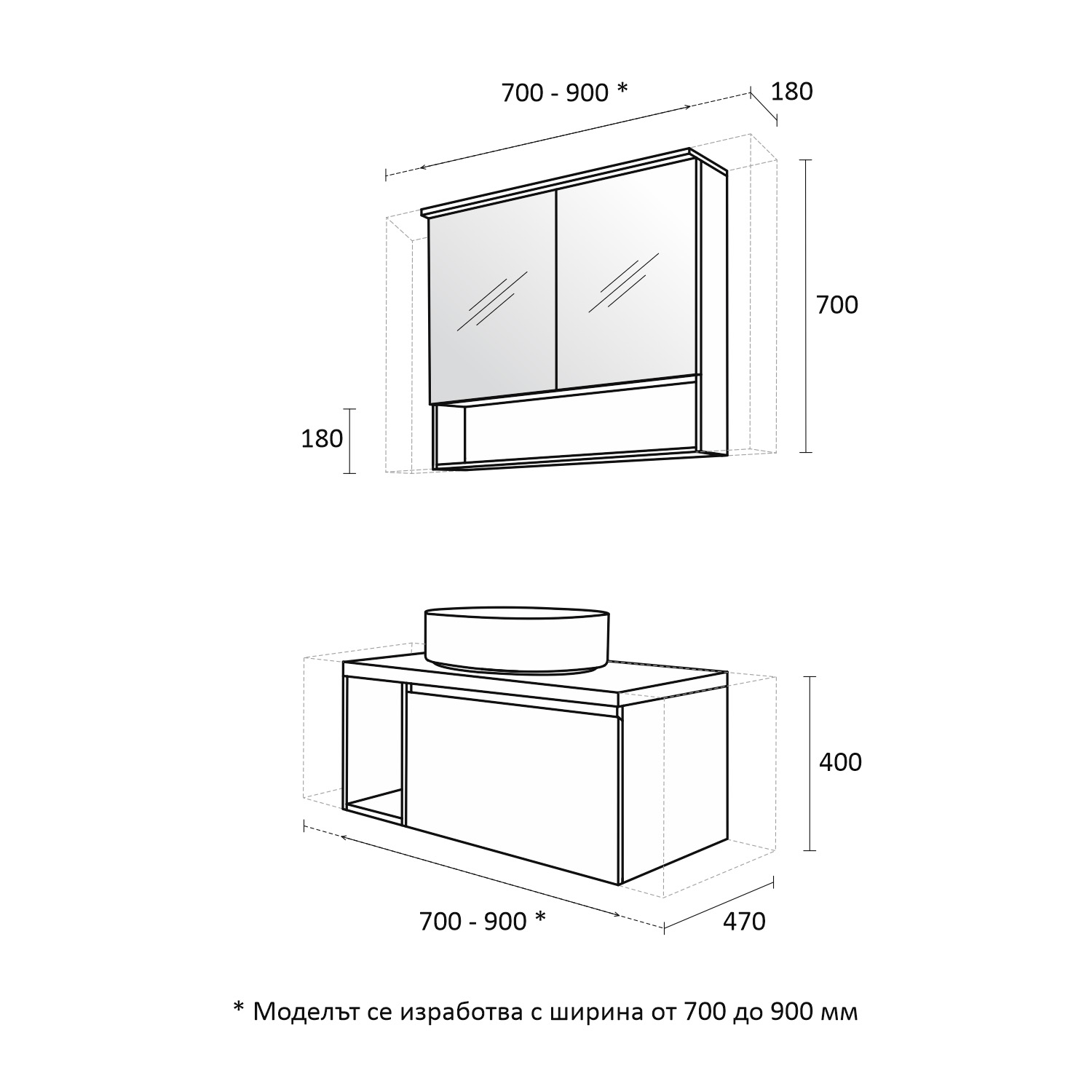 Dimensiuni în mm: Lățime – 900 / Înălțime – 700 / Adâncime – 180