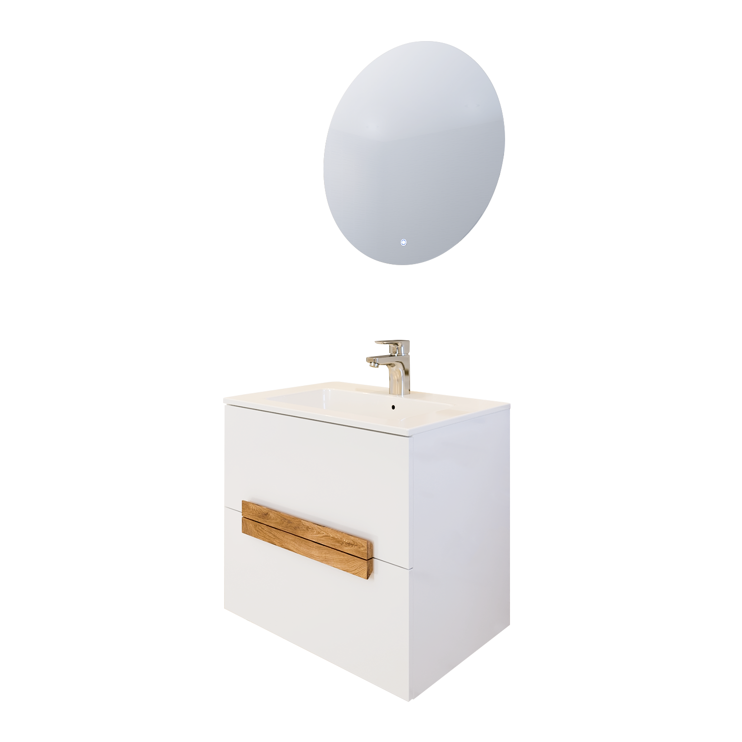 Водоустойчив шкаф в бяло с дръжки в дървесен цвят.