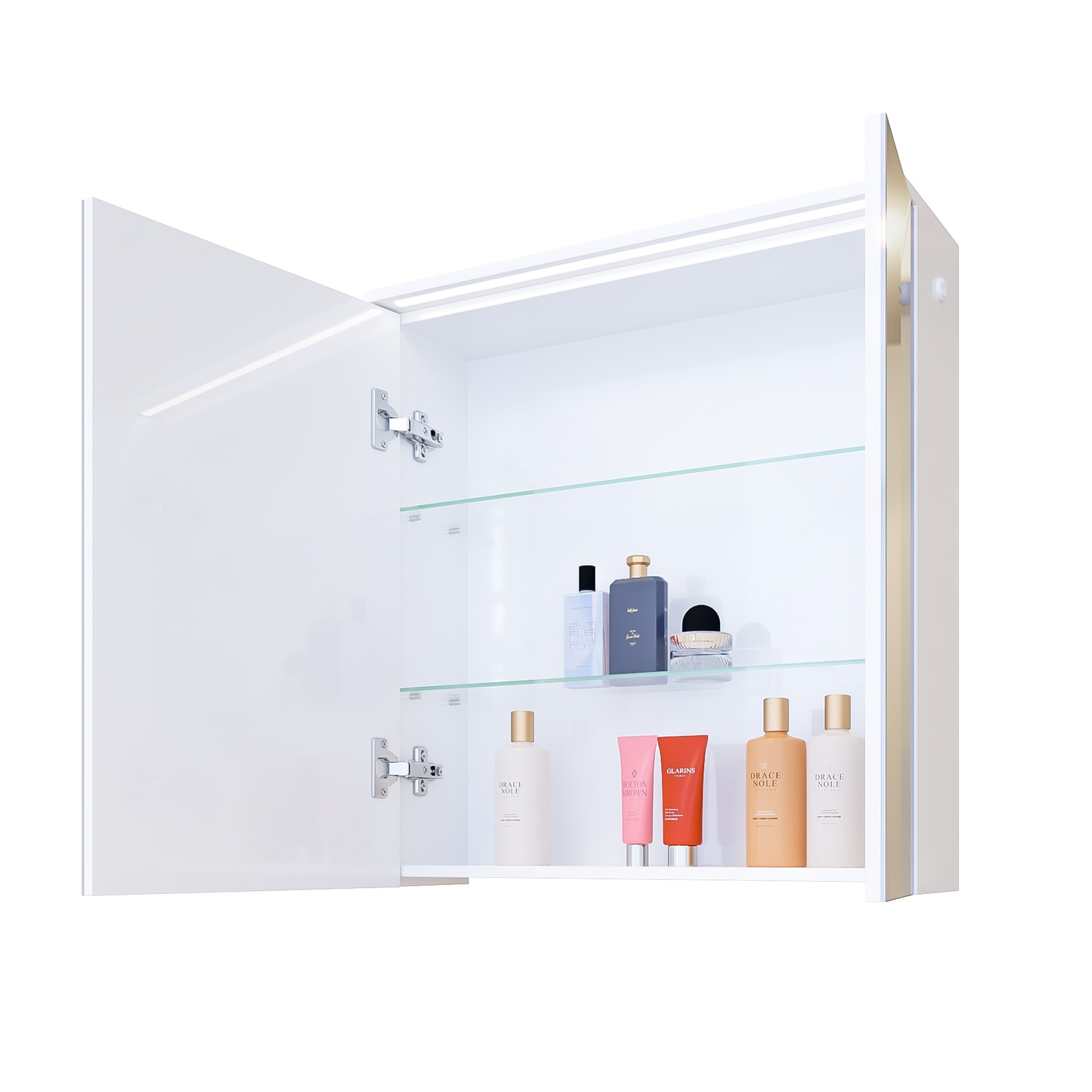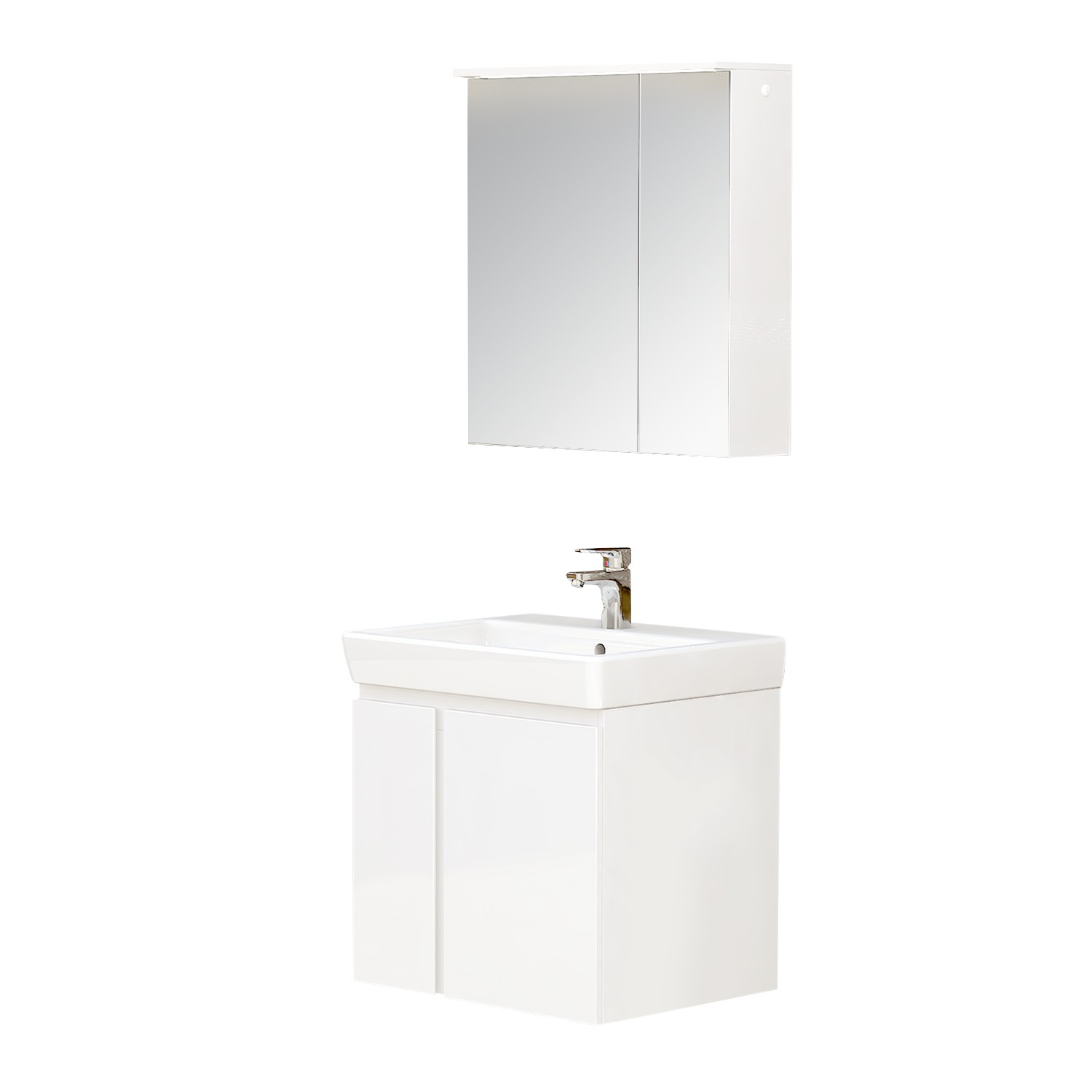Добавете стил във вашата баня с този водоустойчив комплект шкафове с две практични врати и горен шкаф с огледало и LED осветление.