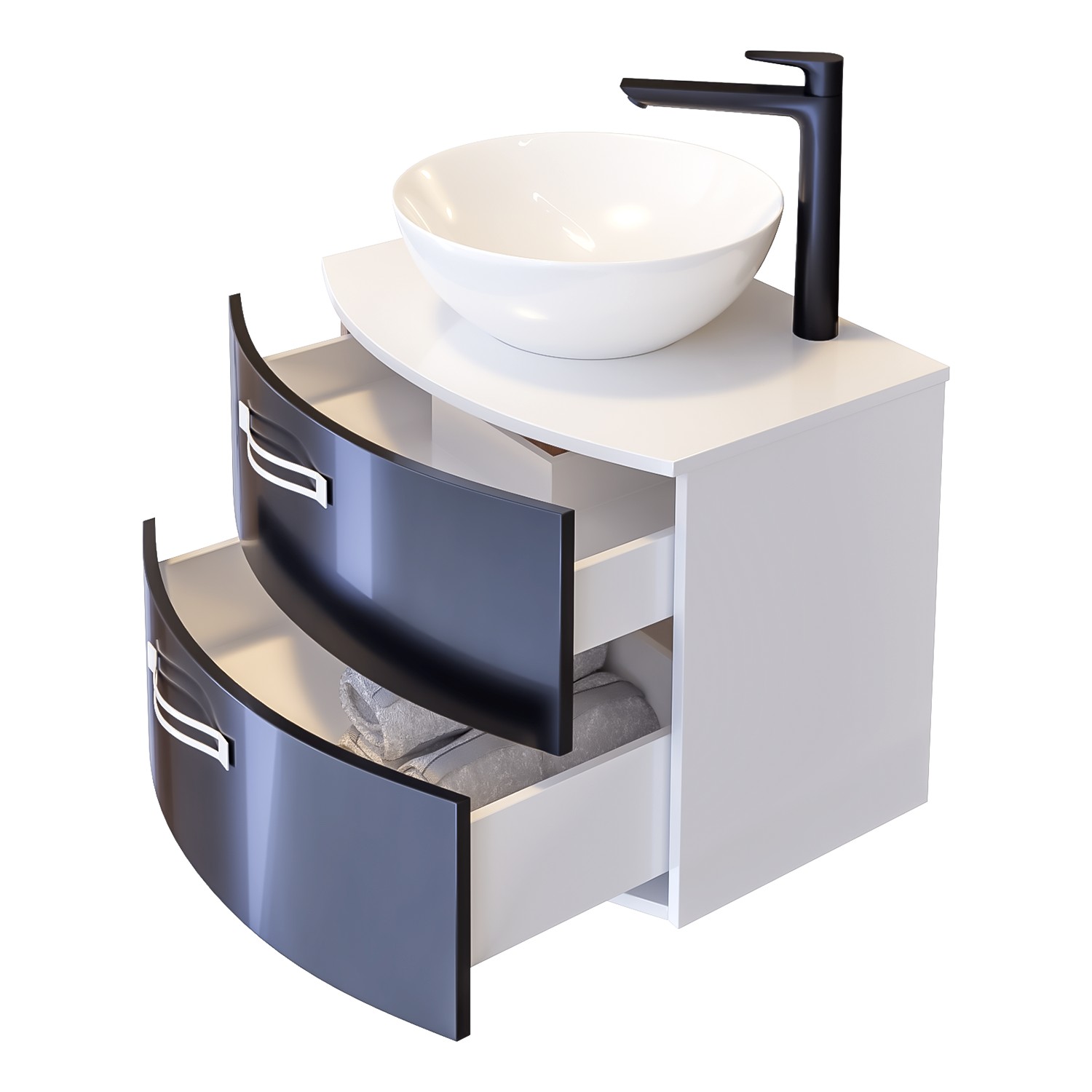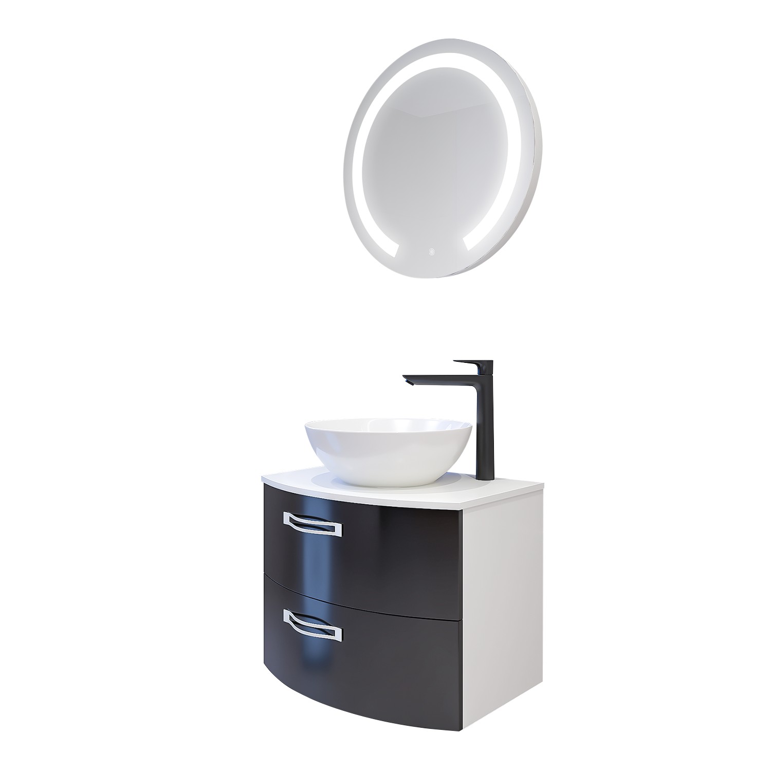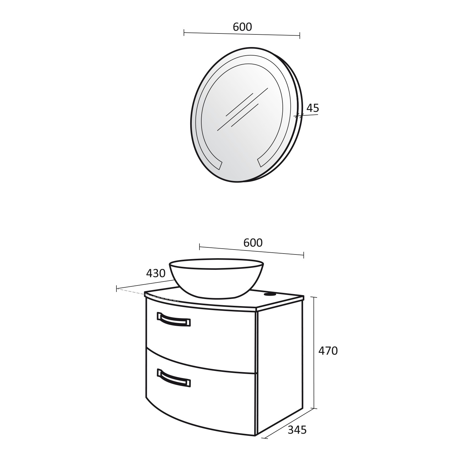 Стилен водоустойчив комплект шкафове със заоблени форми! Долният шкаф предлага две практични чекмеджета с плавно затваряне, а горният разполага с огледало и вградено LED осветление.