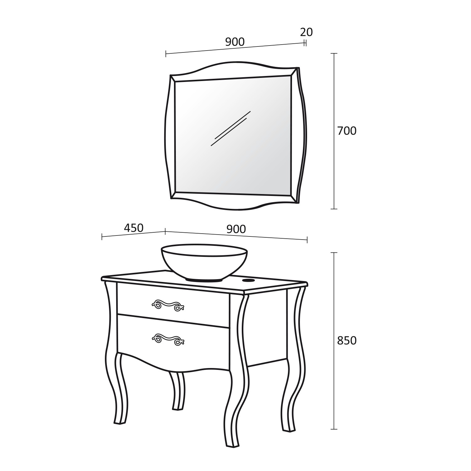 Dimensiuni în mm: Lățime – 900 / Înălțime – 850 / Adâncime – 450