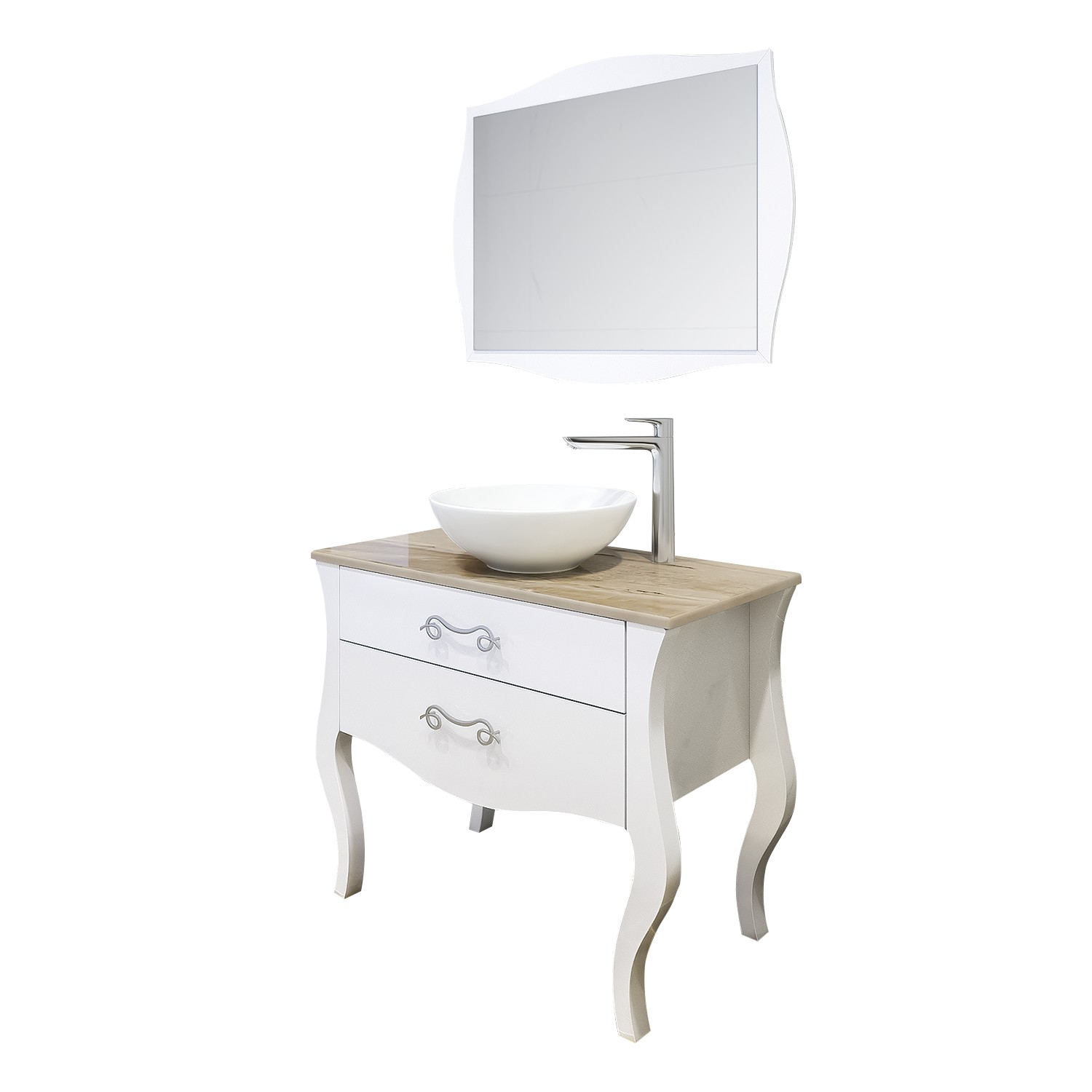 Водоустойчив комплект за баня със стилен плот от естествен камък и модерна мивка купа. Разполага с две практични чекмеджета с плавно затваряне и декоративни дръжки, както и с елегантно огледало.