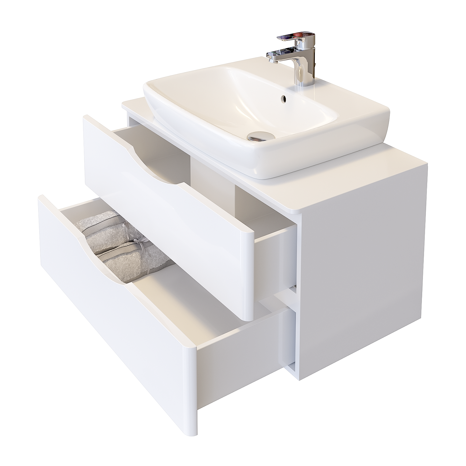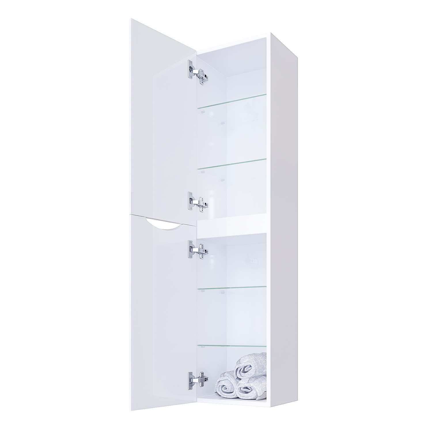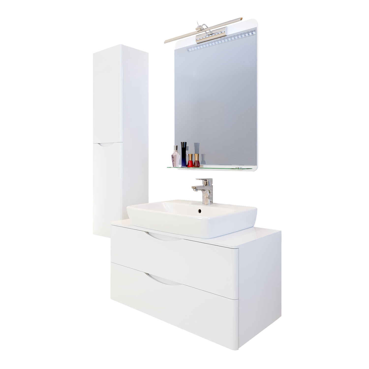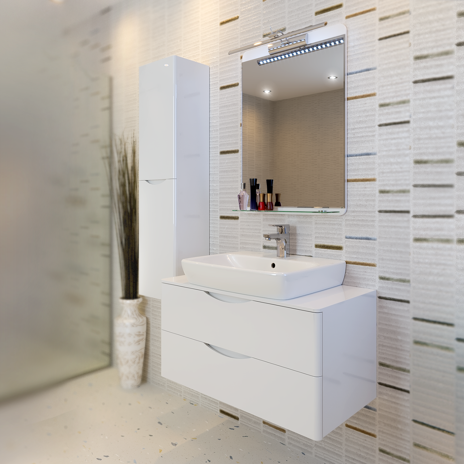 Съвършено водоустойчив комплект шкафове за вашата баня. Долен шкаф с две удобни чекмеджета с плавно затваряне, огледало с LED осветление и практична колона, която предоставя много място за съхранение.