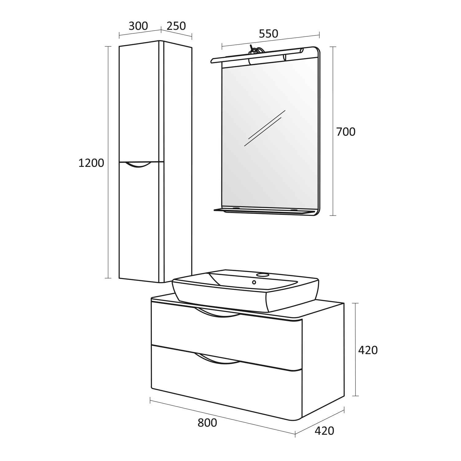 Dimensiuni în mm: Lățime – 800 / Înălțime – 420 / Adâncime – 420
