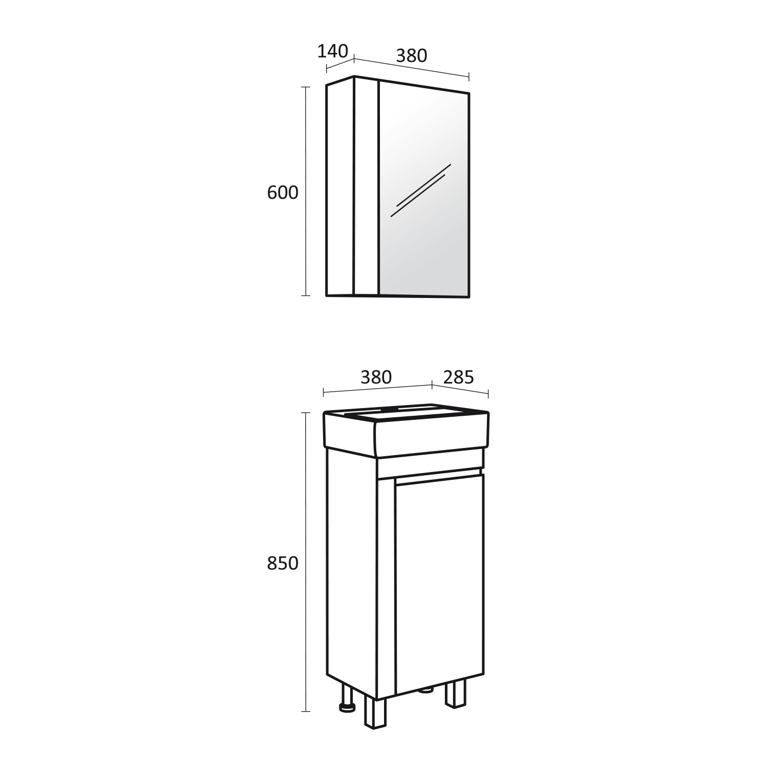 Dimensiuni în mm: Lățime – 380 / Înălțime – 850 / Adâncime – 285