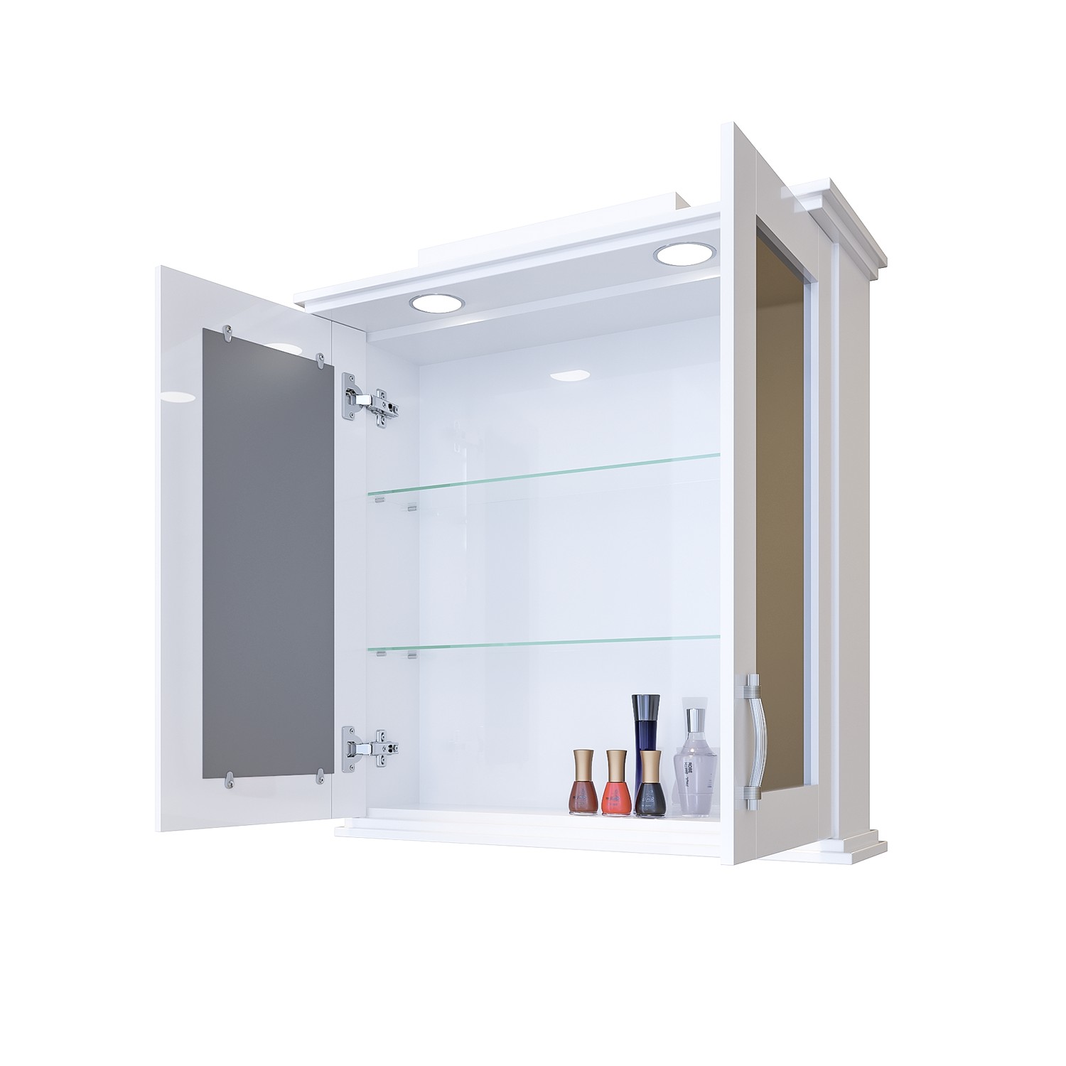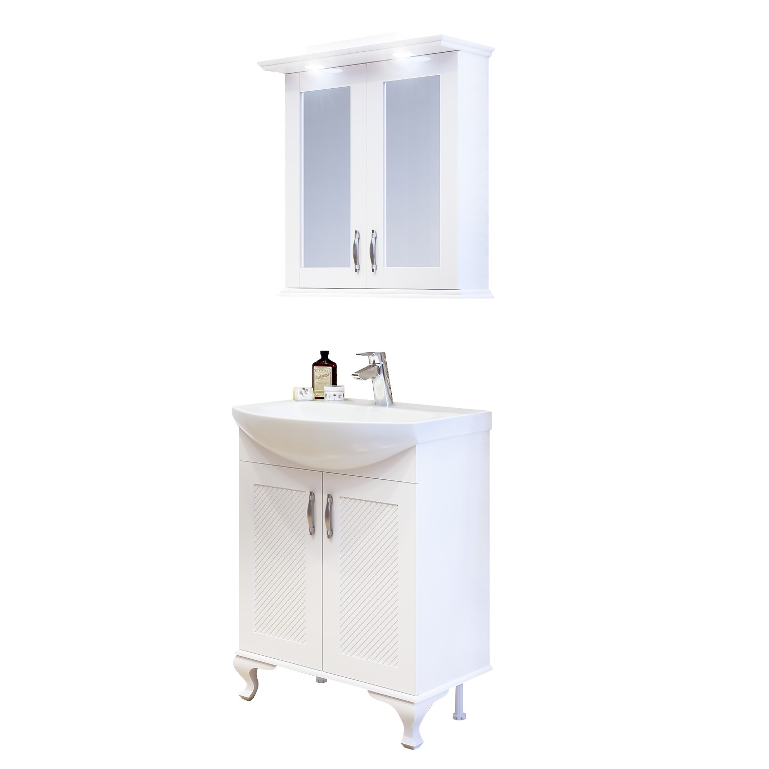 Съвършено водоустойчив комплект шкафове за вашата баня. С две вратички с плавно затваряне и горен шкаф с огледала и LED осветление.